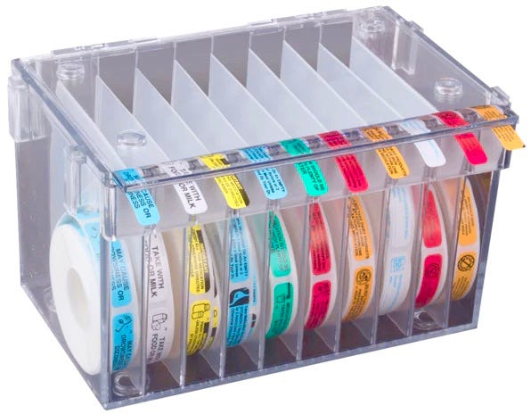 While the dispenser in that photo can handle only 10 rolls of labels, a 20-roll model is also available, and the dispensers are connectible and stackable, so we could assemble a big bank of them to accommodate all 120 label designs at our new pharmacy. Granted, that would probably have a pretty big footprint, so we might need to make room by cutting back on a few superfluous items (pill counters, mortars and pestles, life-saving drugs, etc.), but that seems like a reasonable trade-off. Priorities, right?