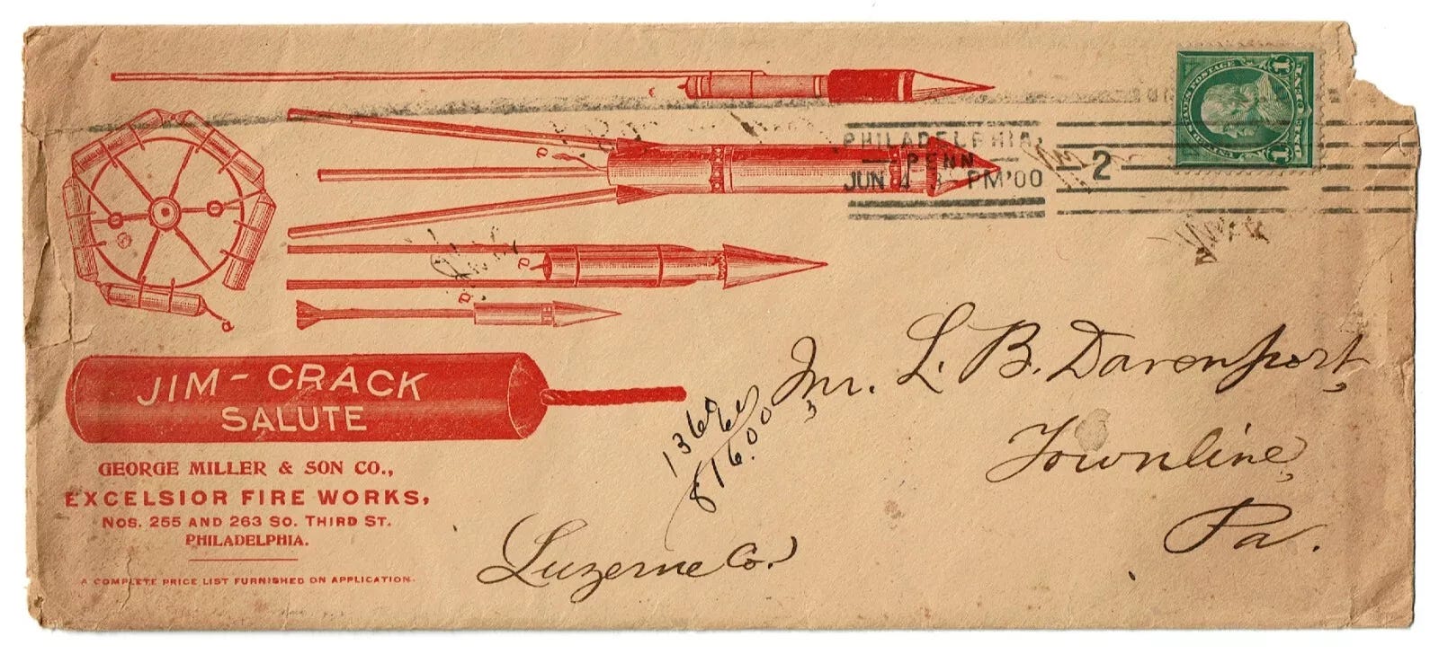 Although July 4th is now behind us, I keep finding cool fireworks-related items to share with you, including this completely amazing vintage envelope from a Philadelphia-based pyrotechnics company: