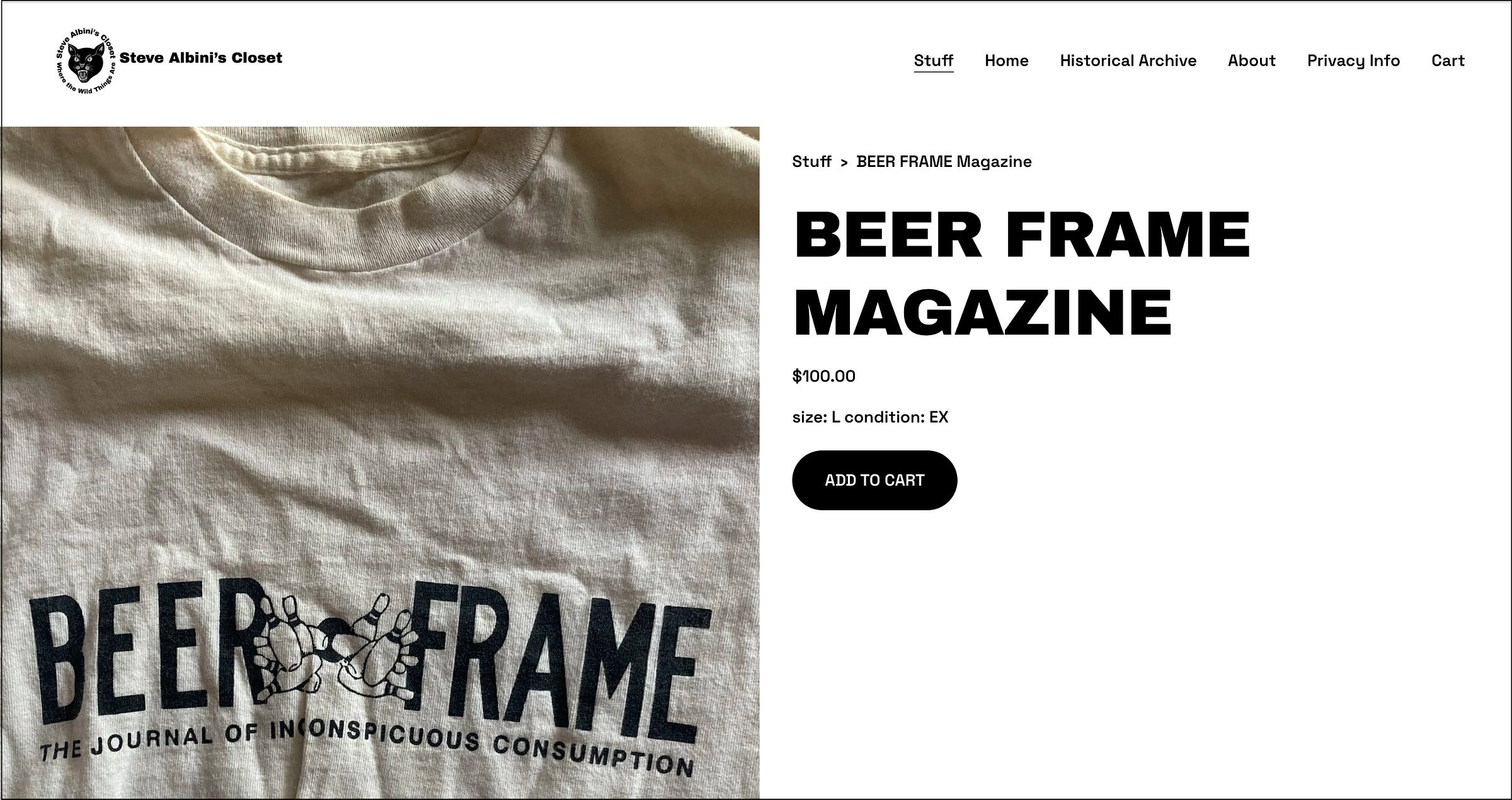 Now Albini has sent me another posthumous signal flare. The story begins in 1995 (or maybe late ’94?), when I went to see Shellac play a show in Manhattan. I’m pretty sure it was at a now-defunct venue called the Thread Waxing Space. I had learned that Albini was a fan of the zine I was publishing at the time, Beer Frame: The Journal of Inconspicuous Consumption (I no longer recall if someone had told me this, or if Albini had mentioned the zine in something he’d written, or what), so I brought along a Beer Frame T-shirt and hoped to give it to him as a way of introducing myself.