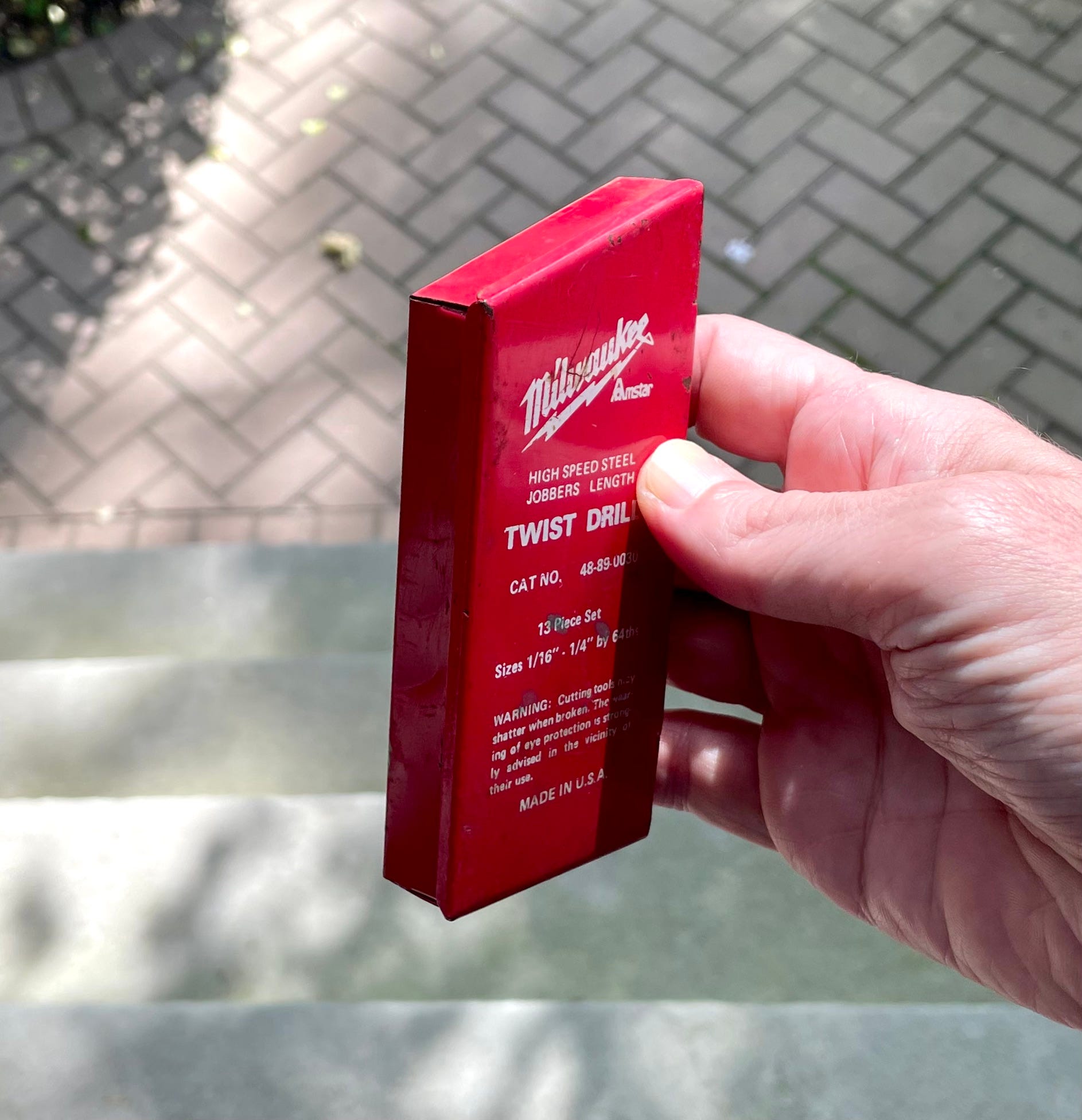 As you can see in the photo above, the case is a small metal trapezoid. I got it about 20 years ago at a flea market — not because I needed drill bits (I already had a set), but because I liked the case so much. Here’s another photo, so you can get a better idea of how thick it is: