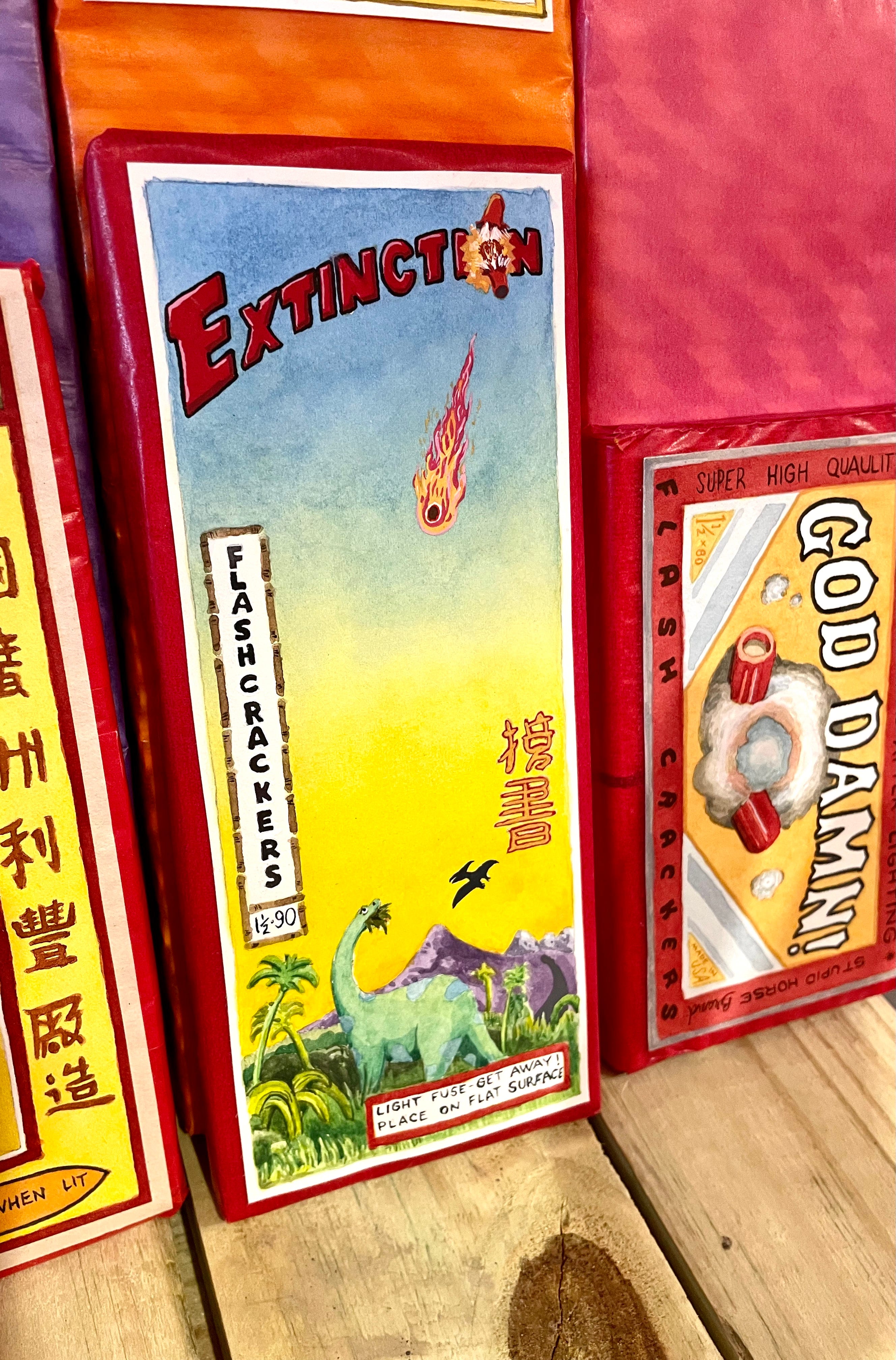 I particularly like this next one — “Extinction” firecrackers, whose package design suggests that the product is explosive enough to have wiped out the dinosaurs: