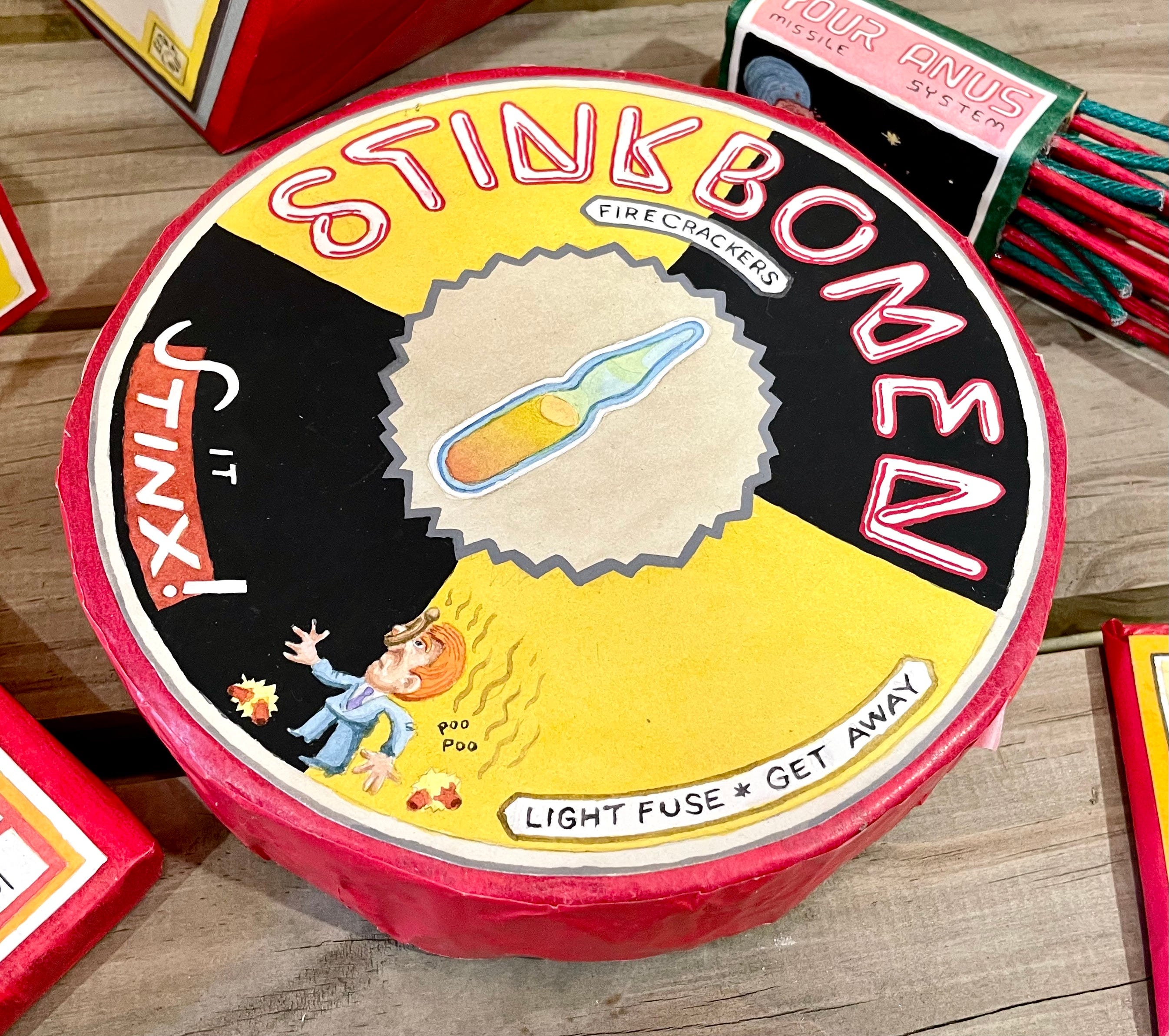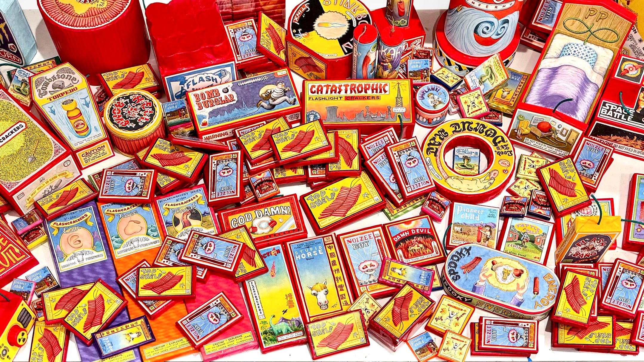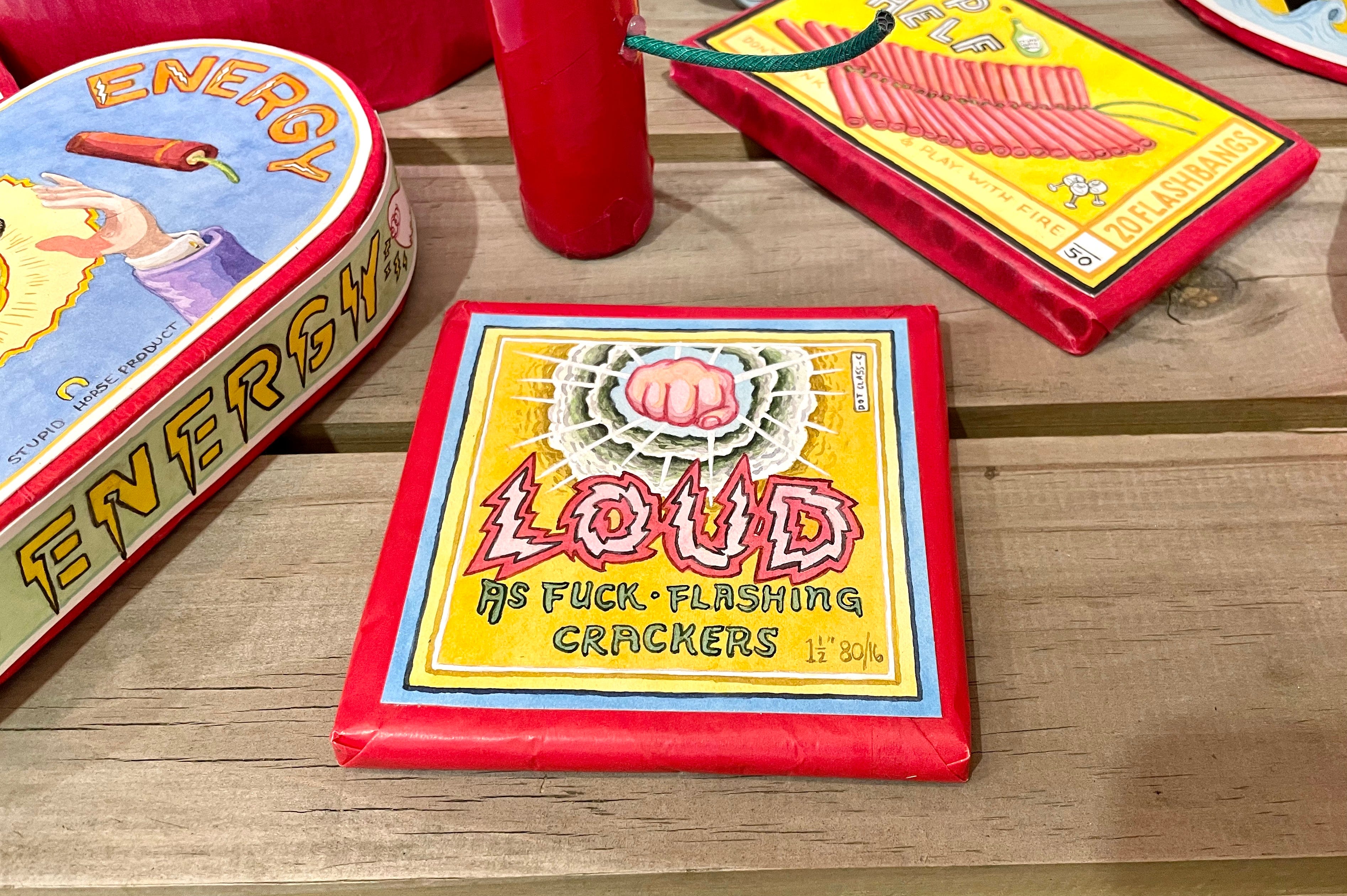From a distance, the display could pass as an assortment of real firecrackers. But when you take a closer look at Teplin’s artwork on the package labels, the gag starts to reveal itself:
