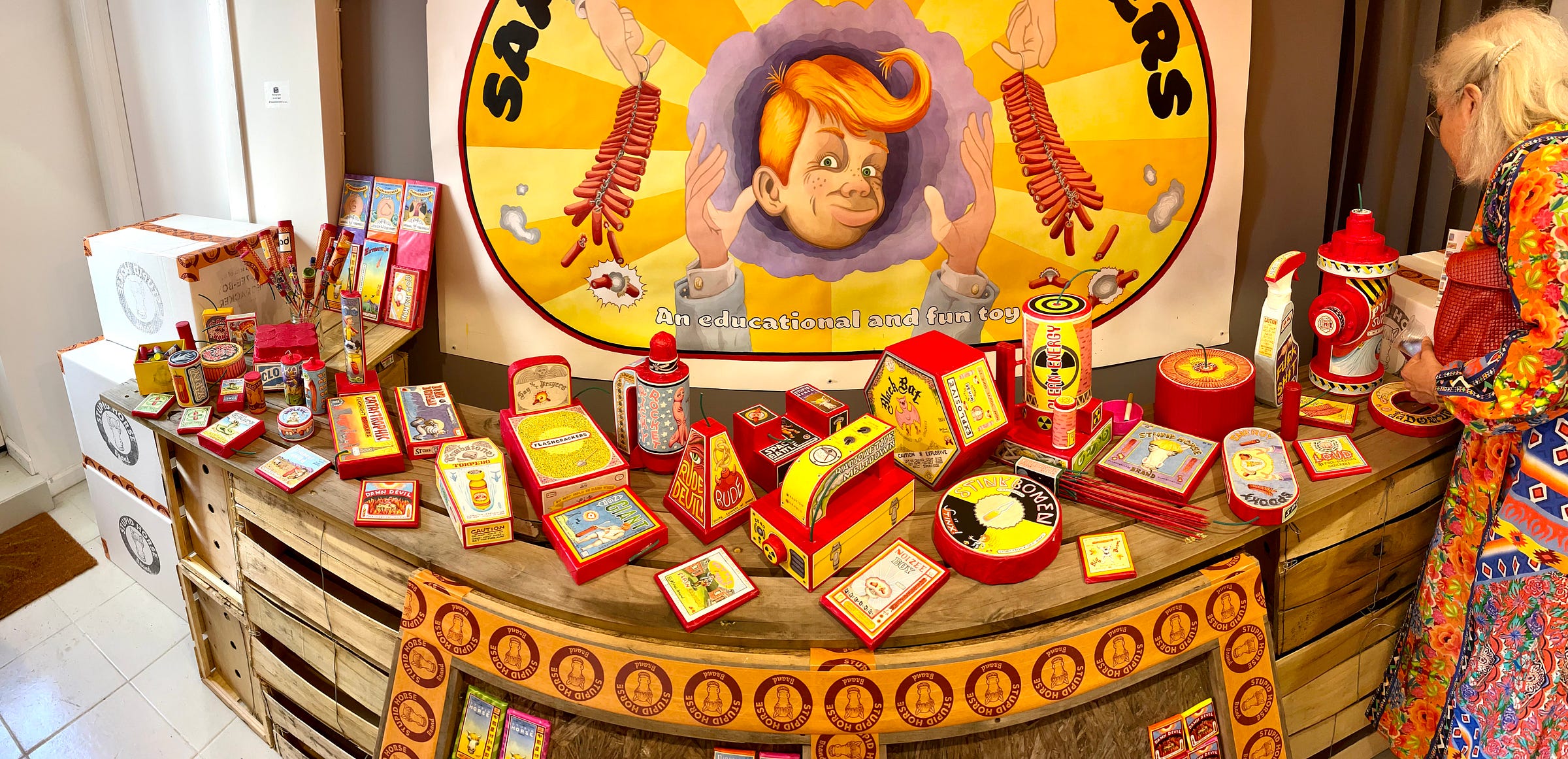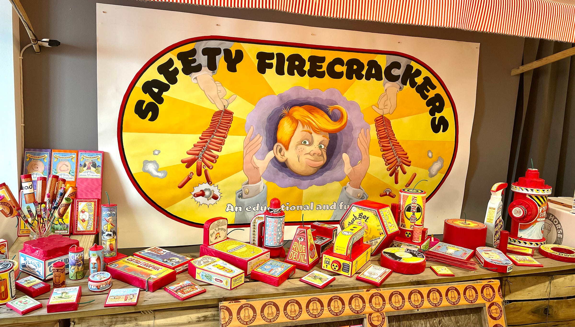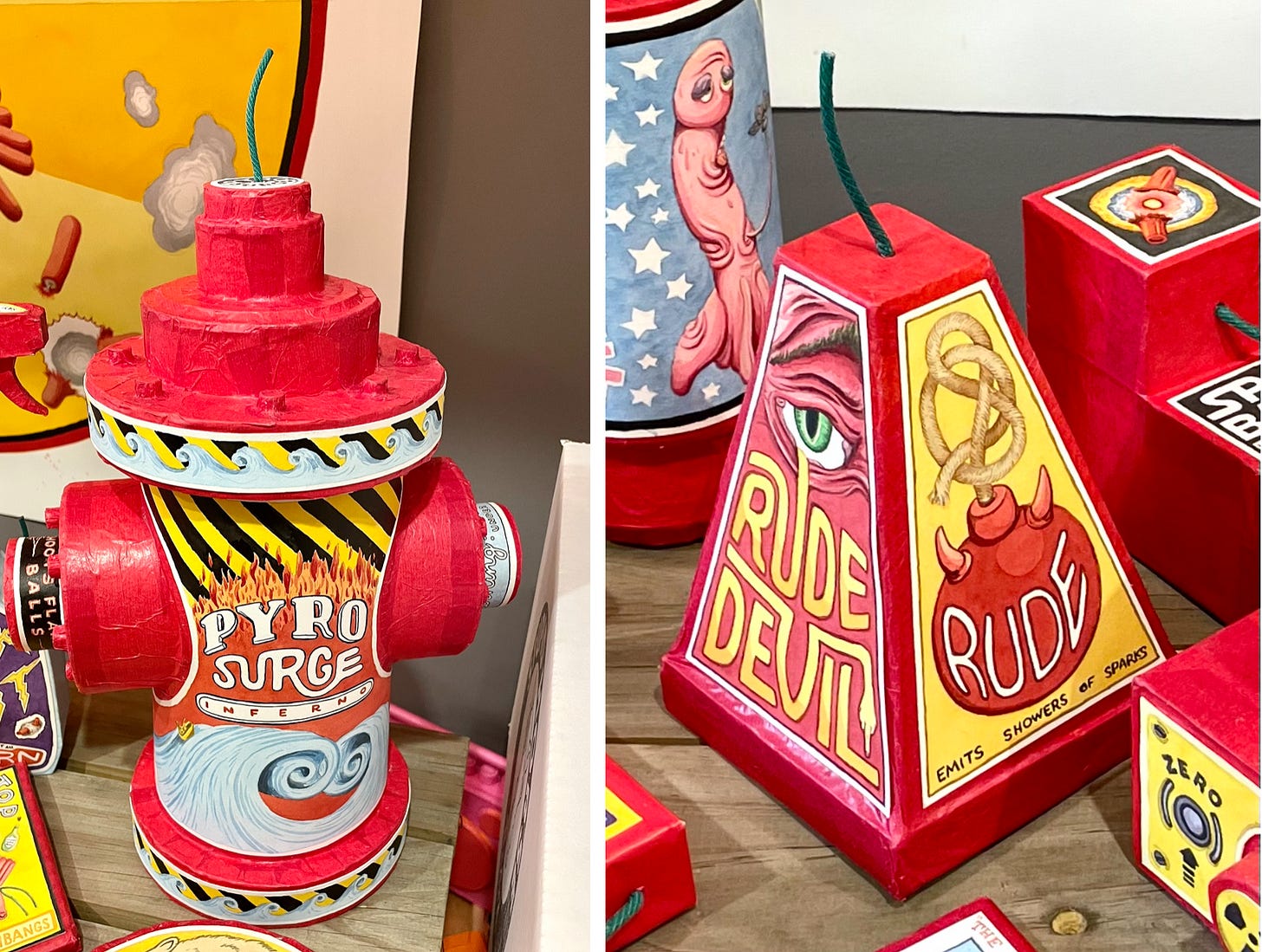 From a distance, the display could pass as an assortment of real firecrackers. But when you take a closer look at Teplin’s artwork on the package labels, the gag starts to reveal itself: