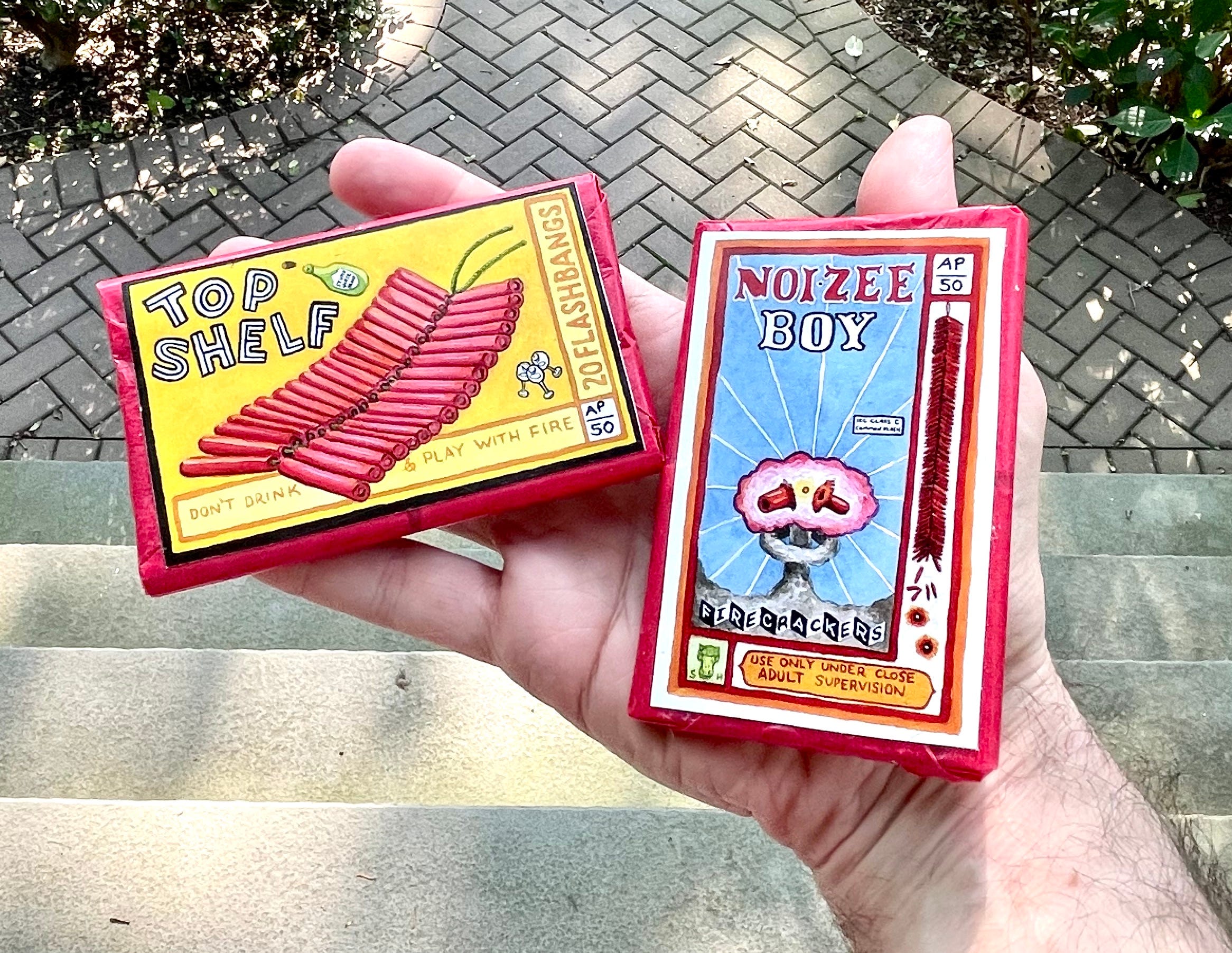 If Teplin had simply done a bunch of paintings of bogus firecracker packages with funny brand names and goofy artwork, Wacky Packs–style, I’m sure that would’ve been plenty entertaining. But he’s gone way beyond that. He’s created actual packages of realistic-looking faux pyrotechnics, each one adorned with his artwork. Here are two sample packs that he sent me prior to the launch of the gallery show:
