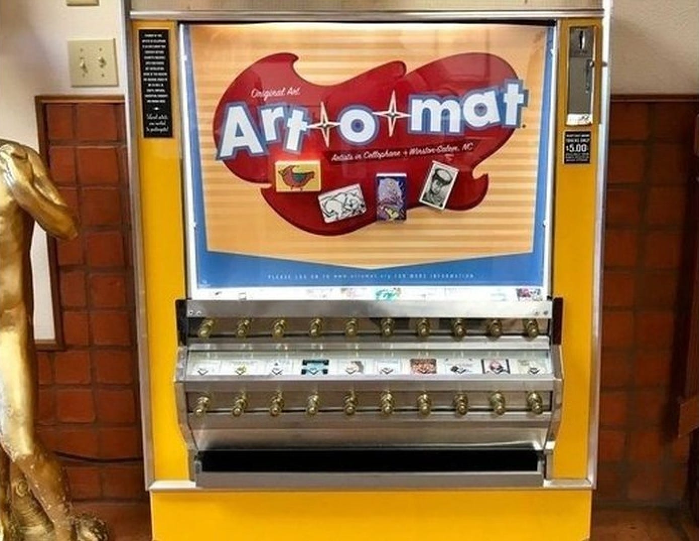 Old cigarette vending machines are increasingly being repurposed to sell art (as shown above). The excellently named trade magazine Vending Times has the details, and you can do a deeper dive at ArtOmat.org.