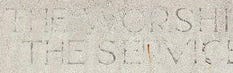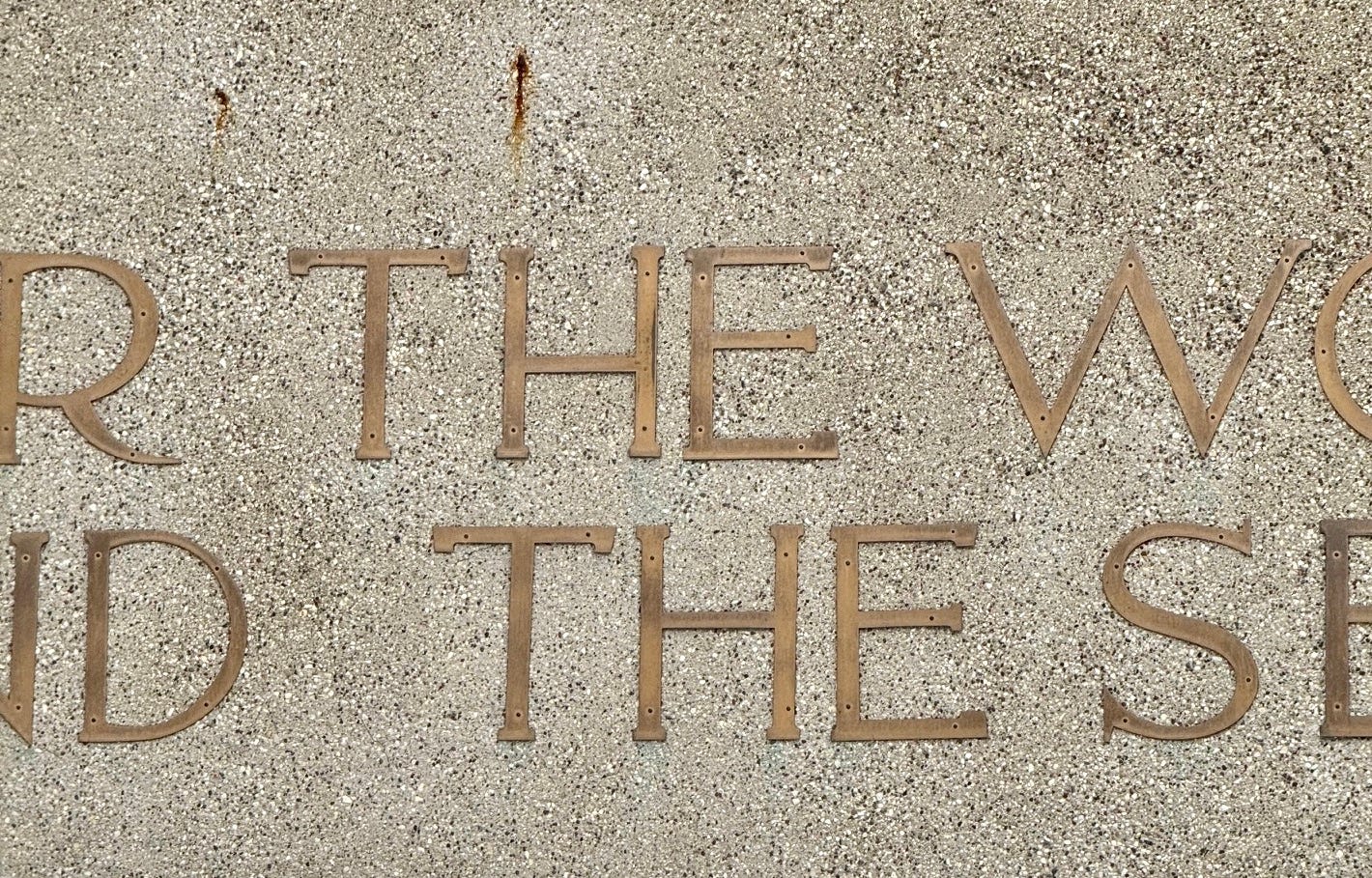 Let’s zoom in on a section of the bronze lettering above the doors:
