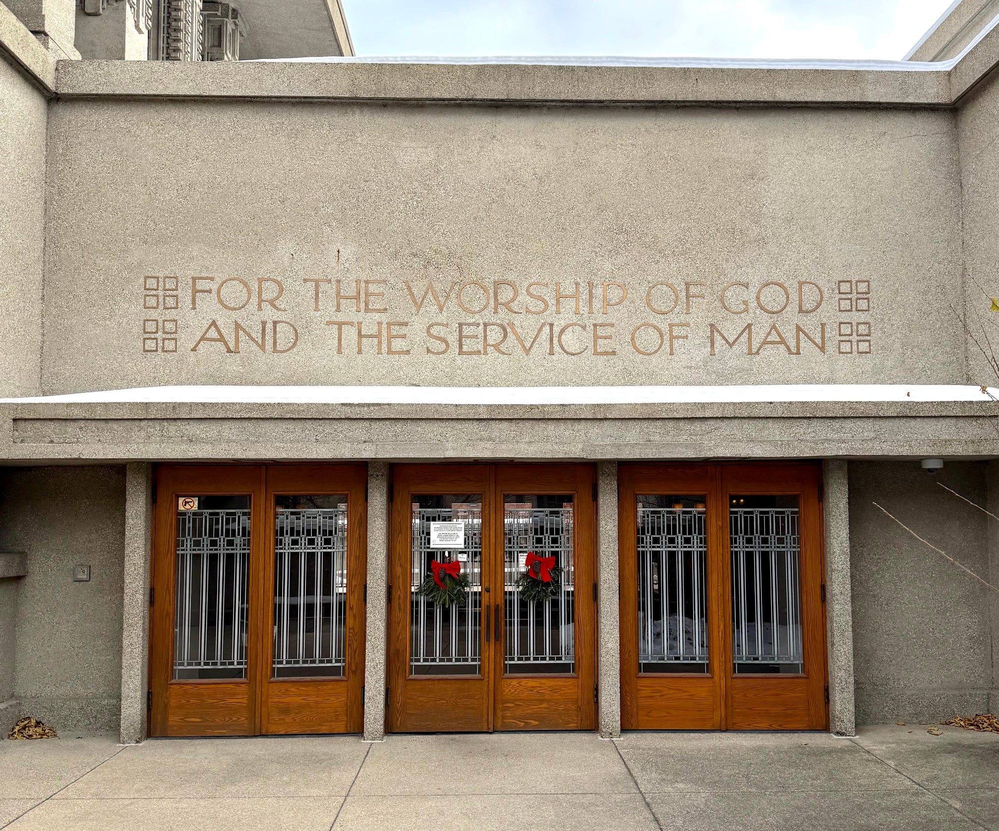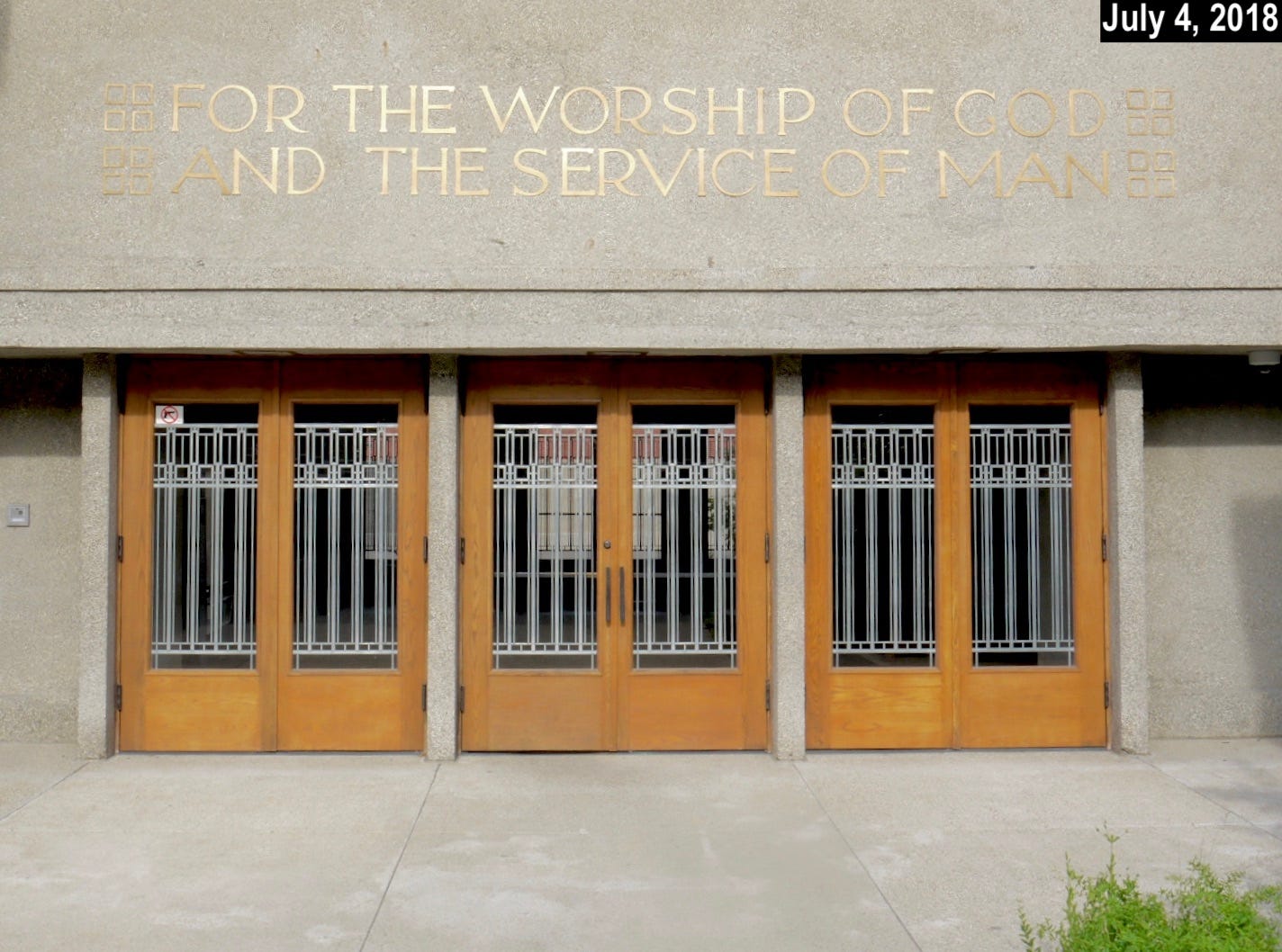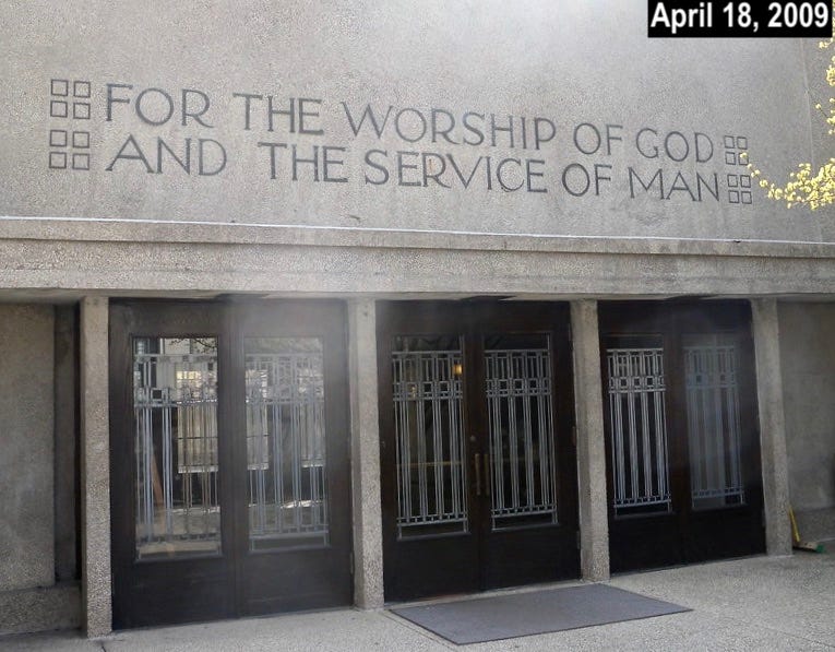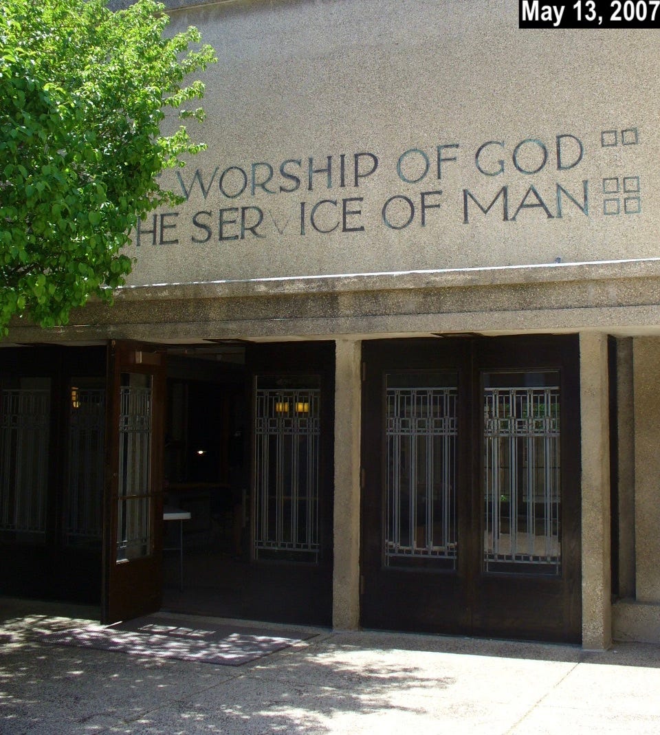 The photo above, taken about two and a half months ago, shows the entrance to Unity Temple, a Unitarian Universalist church in the Chicago suburb of Oak Park, Illinois. Designed by the renowned architect Frank Lloyd Wright (himself a lifelong Unitarian), it opened in 1908 and is sometimes referred to as the world’s first modern building. Wright later said that the Unity Temple project was when he stopped being an “architect of structure” and instead became an “architect of space.”