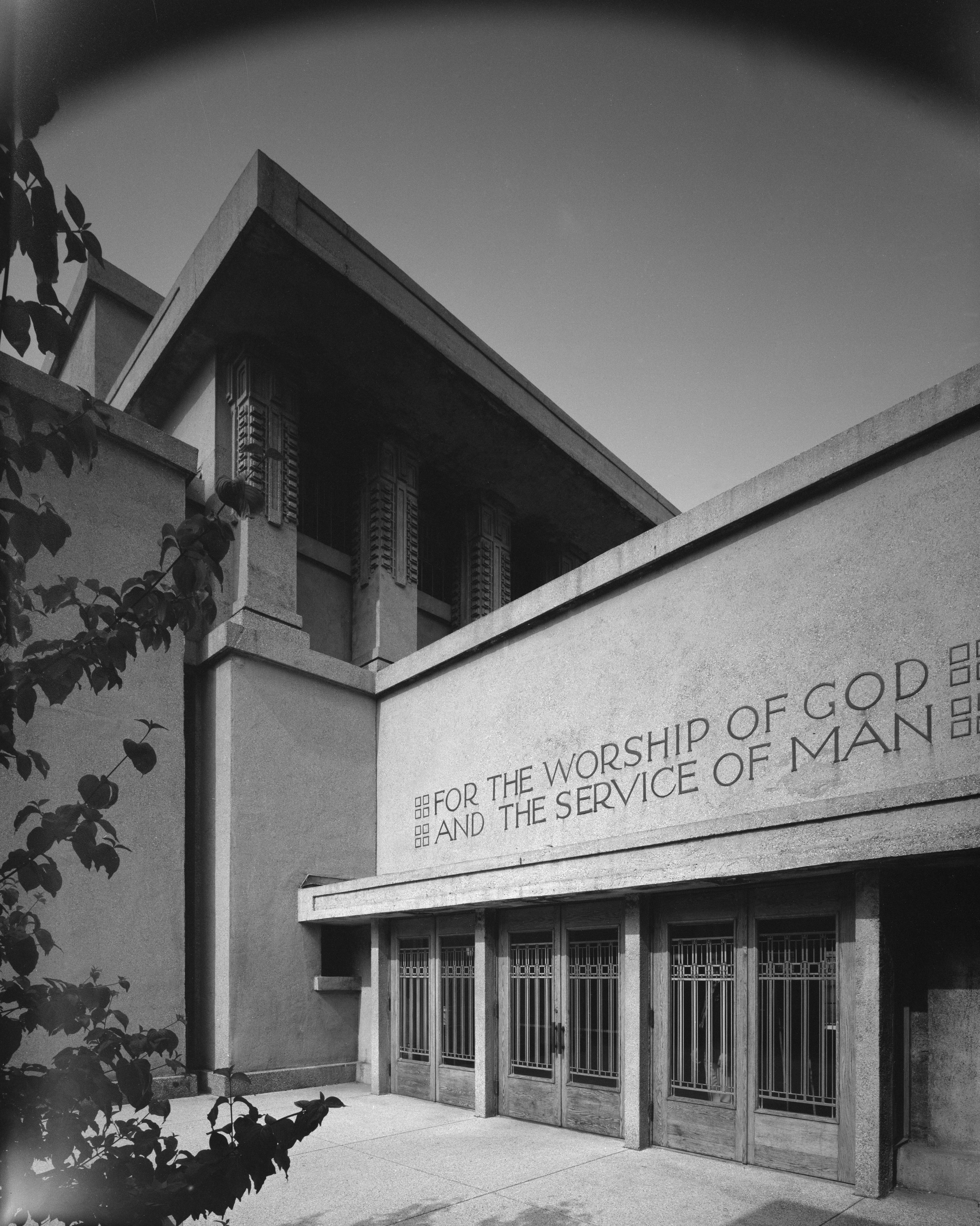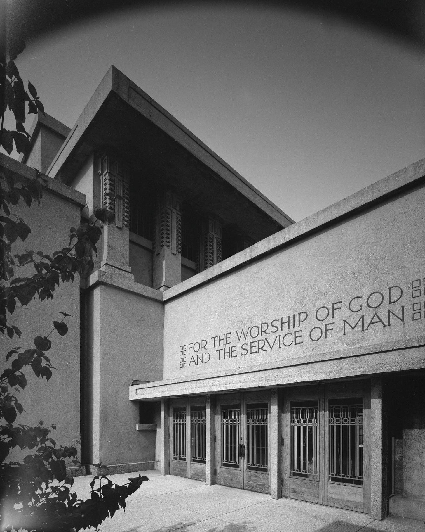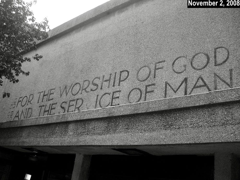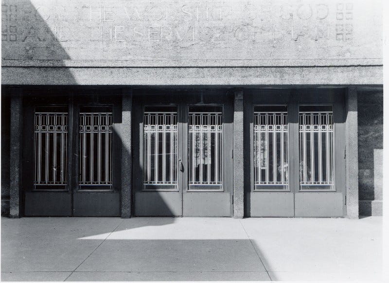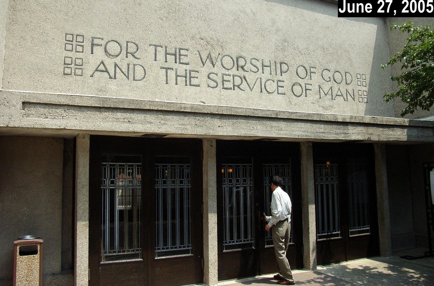 The photo above, taken about two and a half months ago, shows the entrance to Unity Temple, a Unitarian Universalist church in the Chicago suburb of Oak Park, Illinois. Designed by the renowned architect Frank Lloyd Wright (himself a lifelong Unitarian), it opened in 1908 and is sometimes referred to as the world’s first modern building. Wright later said that the Unity Temple project was when he stopped being an “architect of structure” and instead became an “architect of space.”