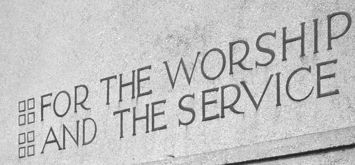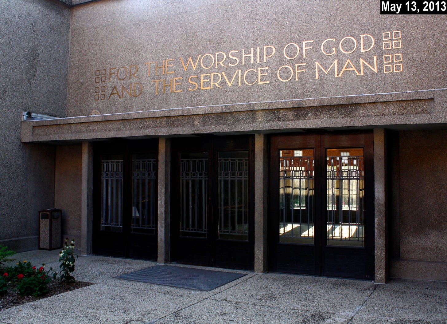 Unity Temple has two separate entrances, one at the east and one at the west. Each entrance is adorned with identical metal lettering spelling out the same phrase: “For the Worship of God and the Service of Man.” (Jonathan’s photos are of the western entrance, and he didn’t realize there’s an identical sign on the eastern side. If he had known, he would have checked the eastern “H” situation.)
