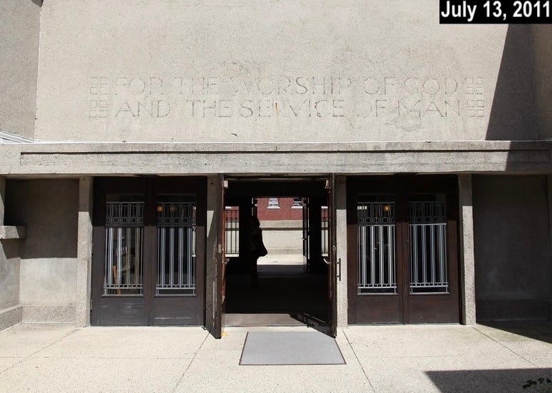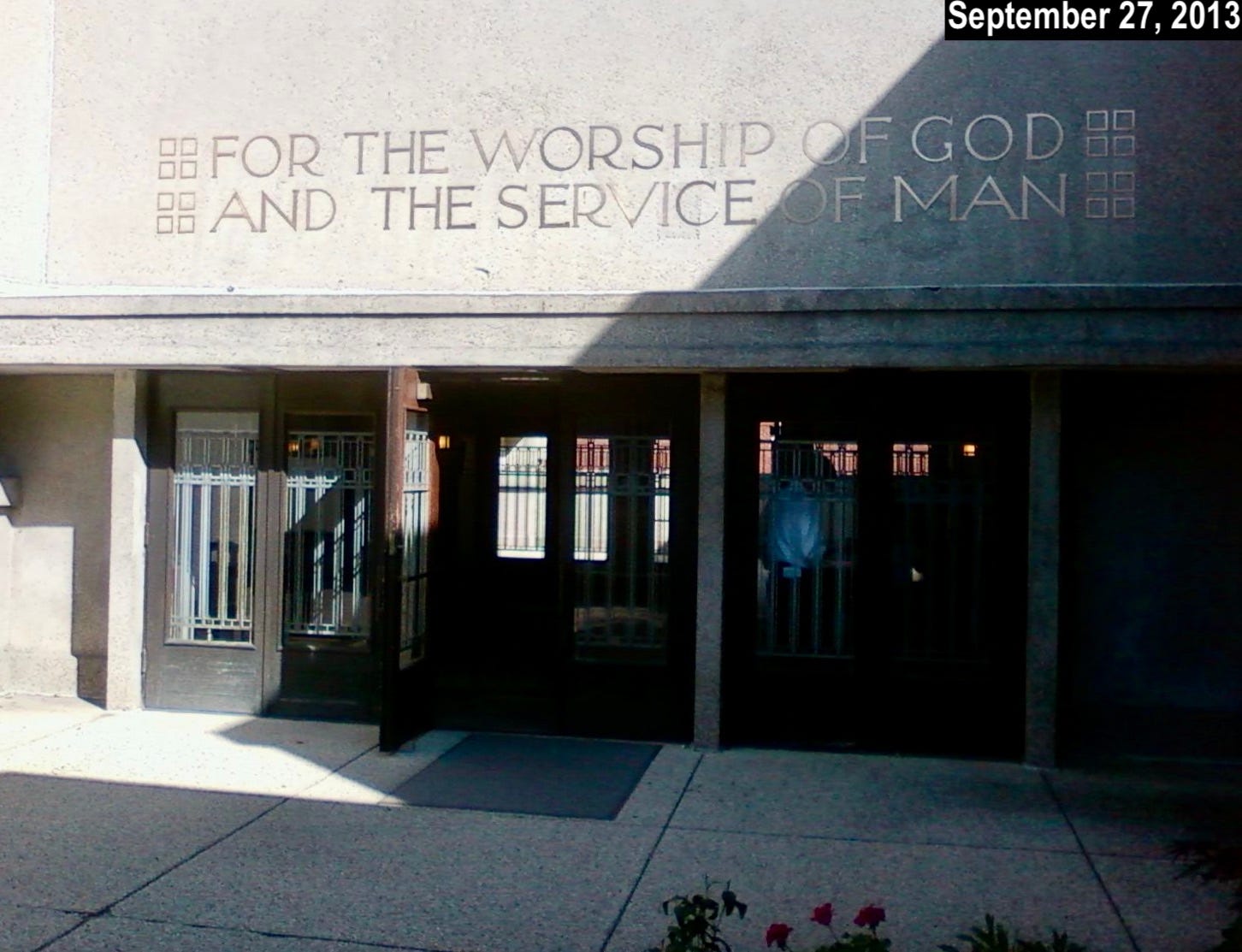 Photos of the eastern entrance from this period were harder to come by, in part because a tree was obscuring part of the sign. But in this 2007 shot, it appears that the “S” in “WORSHIP” is upside-down, as is the “H” on the second line (plus the “V” in “SERVICE” is missing, but that’s a separate issue):