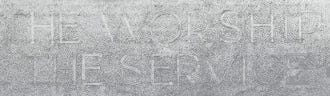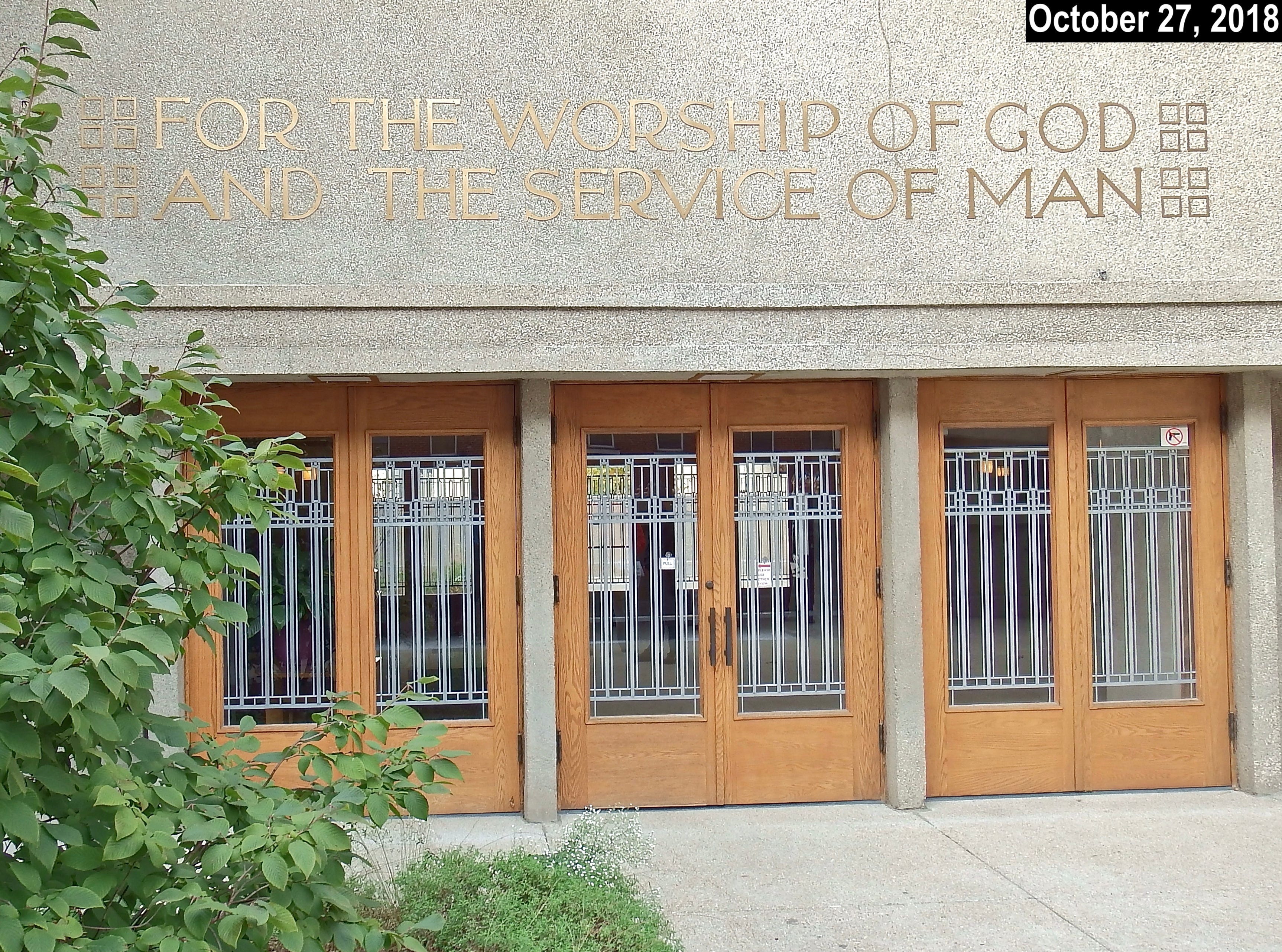 The photo above once again shows the western entrance, and there are two significant changes. The good news is that all of the “H”s are now properly orientated. To see the bad news, look at the “S” in “WORSHIP” — now that is upside-down! (The other “S,” in “SERVICE,” is properly oriented.)