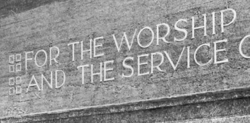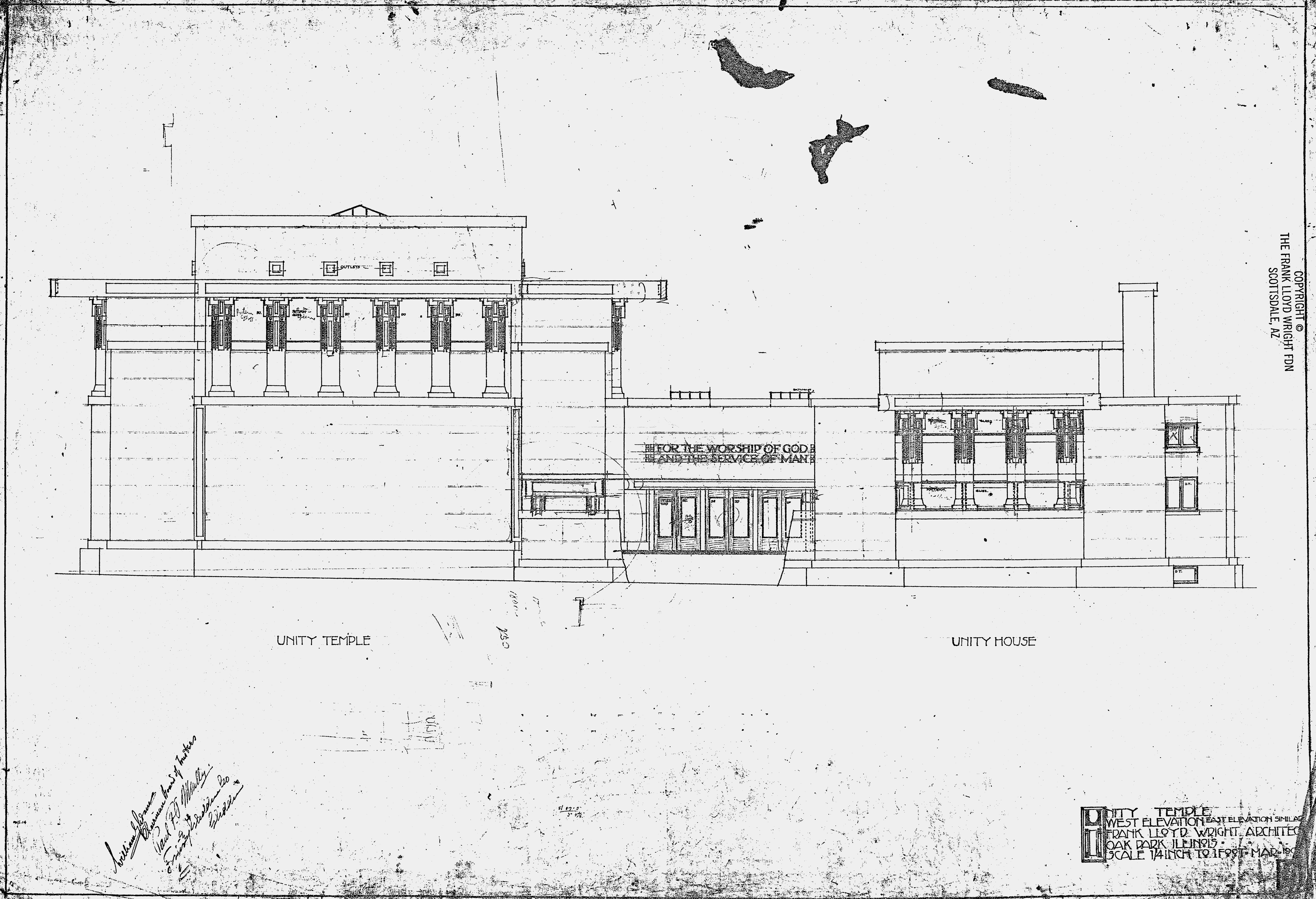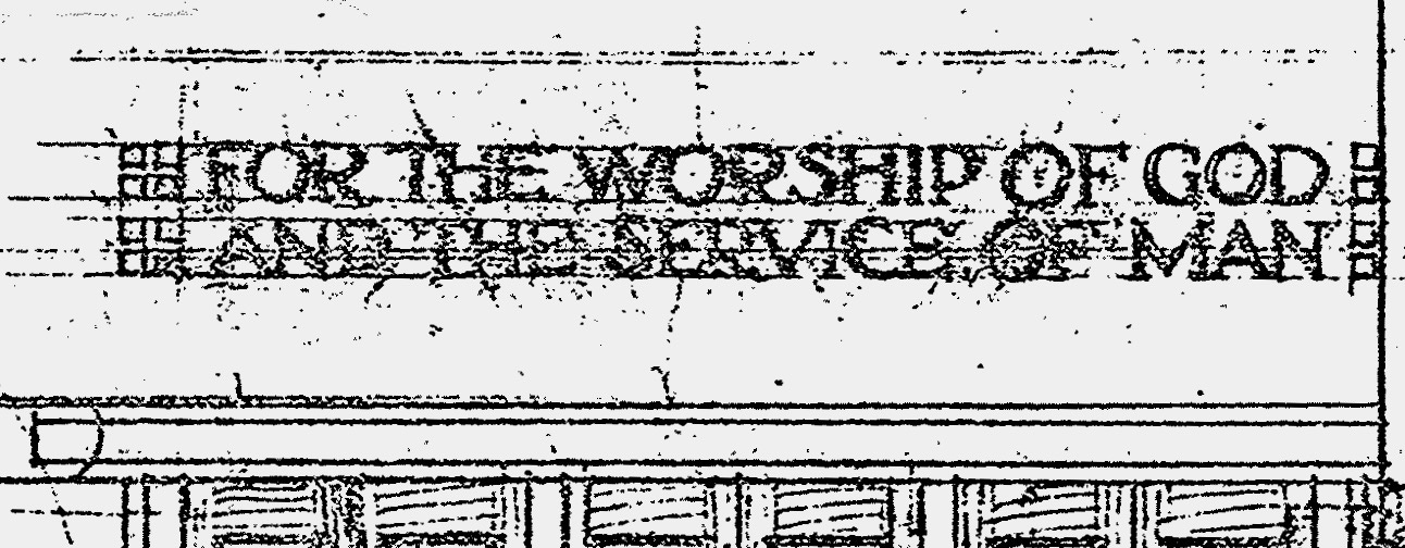 Wright’s original drawings for Unity Temple, shown above, include depictions of the lettering. Let’s zoom in to get a closer look at the key area: