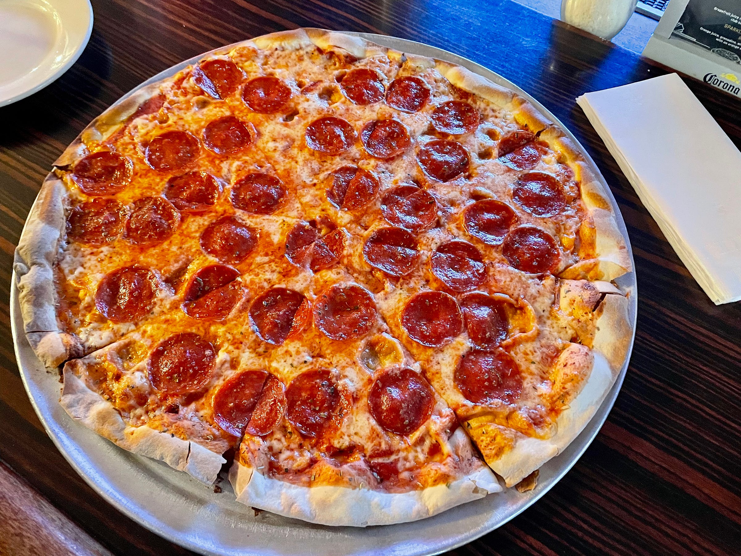 Obsessive flights of fancy can be triggered by the most unlikely things — including, as it turns out, a pizza at Nancy’s Townehouse, an old-school Italian restaurant that my friend Adriene and I visited on Saturday. Nancy’s, which has been operating since 1943 in Rahway, New Jersey, specializes in thin-crust pizza, so we ordered a pepperoni pie (which was very good). When the pizza arrived, I immediately noticed that it had one particularly intriguing detail. Can you spot it in the photo shown above?