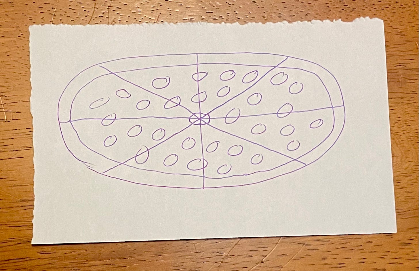 The thing that caught my attention was the slice of pepperoni that’s situated almost at the exact center of the pie. Because of its location, it got sliced into six different pieces, each one located at the tip of a different pizza slice. If only it had been truly dead-center, it could have been cut into eight pieces, just like the pizza itself, something like this: