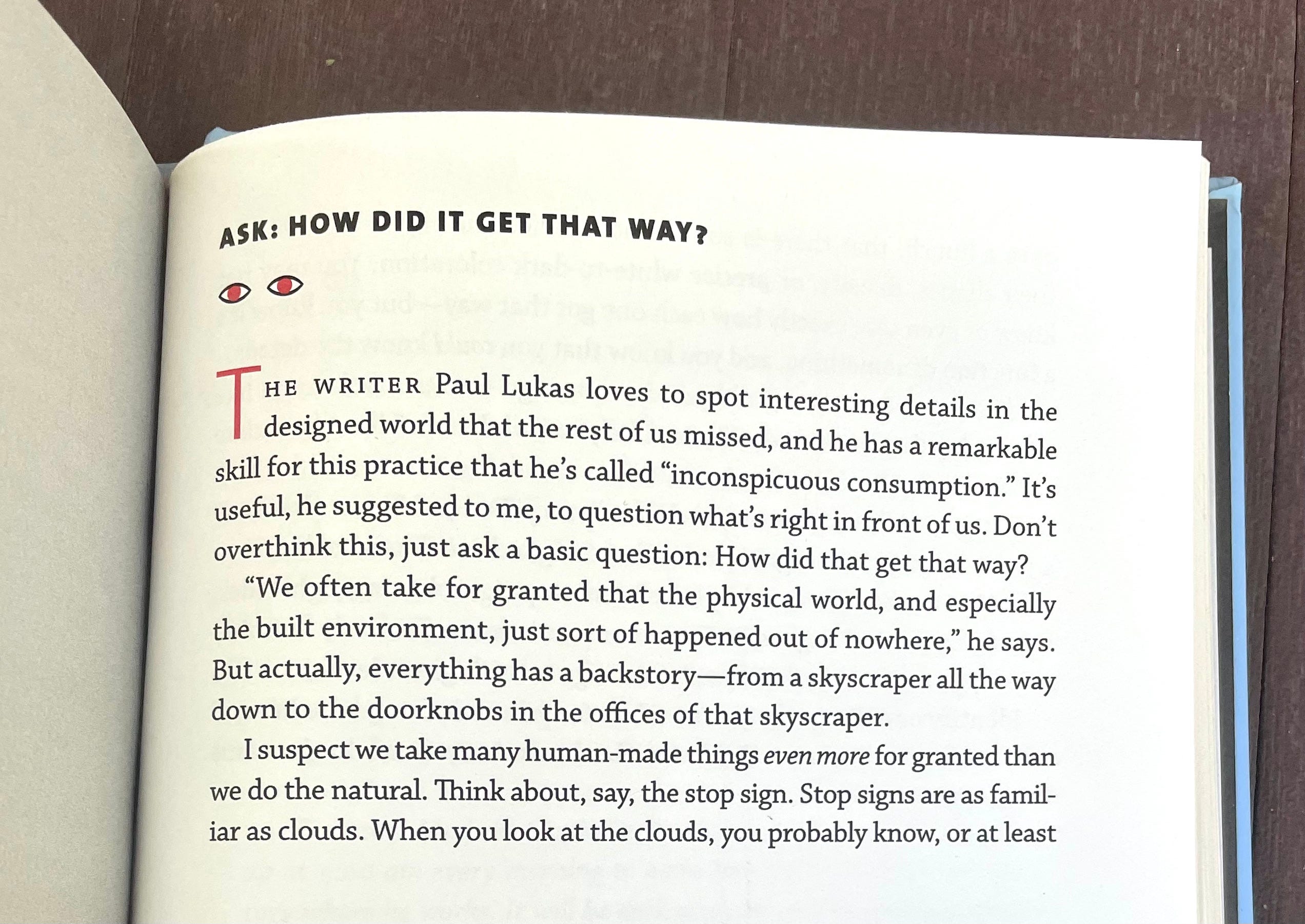 Paul: I remember when you were putting the book together, you asked me to create an exercise, although I don’t recall if you phrased it that way. And I told you that when I see something in the world, I often ask myself “How did that get that way?” And you included that in the book. I think that exercise is a pretty apt way of describing what I do with Inconspicuous Consumption, because I tend to look at things and ask questions: Why is it there? How did it get there? Who made it? Who designed it? Who decided it was necessary?