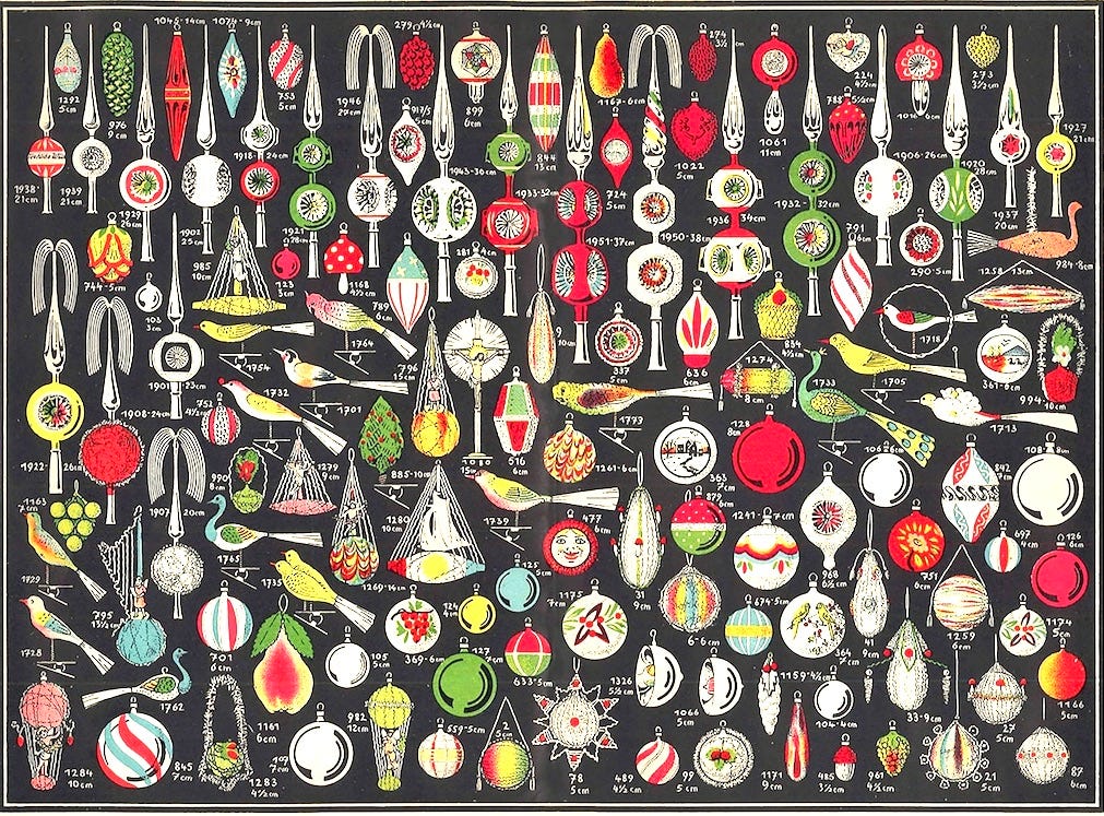 Let’s start with the amazing Christmas tree ornament illustration shown above, which is from a 1930s wholesale catalog. I love the colors, the composition, the seemingly endless variety of birds and baubles, the sense of obsessive completism, and even the little catalog numbers. Obviously, I realize it’s a little odd to be sharing this with you in January, but it’s so mind-blowingly good that I figure nobody will mind. I stumbled upon it on Etsy, where you can buy a reproduction of the original page as a poster.