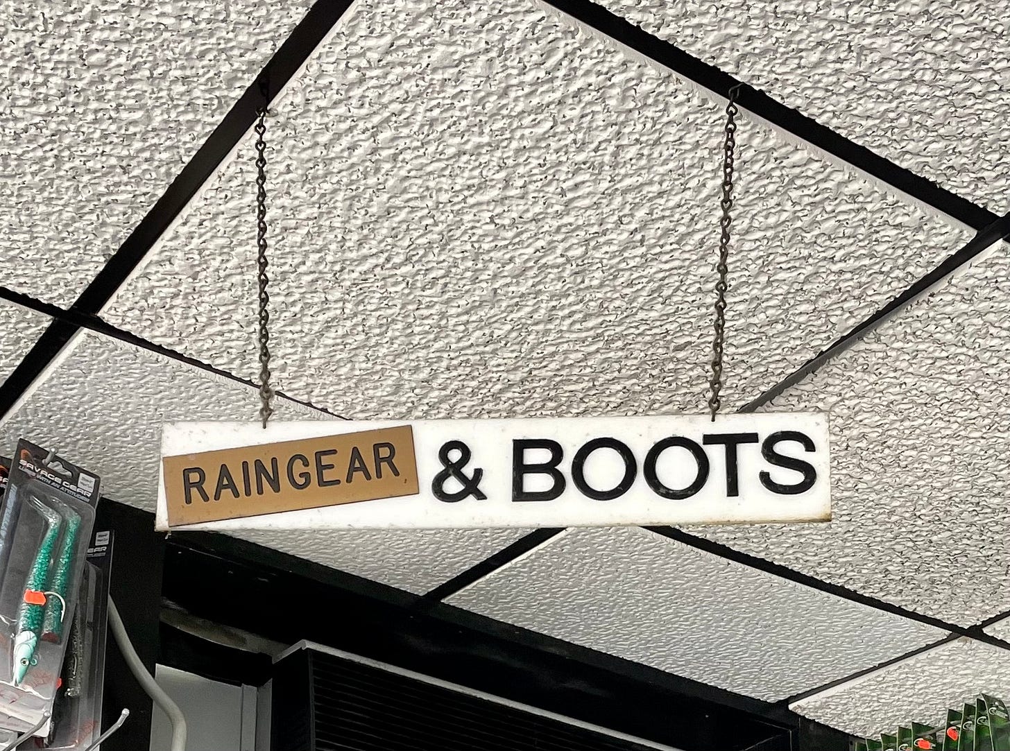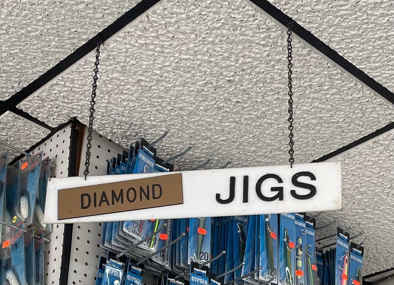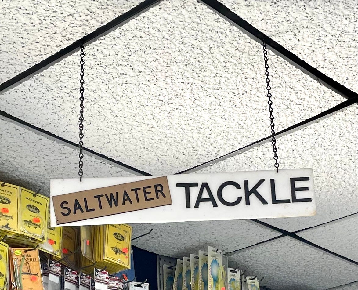 I stopped in the other day at Jack’s Bait & Tackle, an 80-year-old shop in the Bronx. As you can see in the photo above, they have a series of signs hanging from the ceiling. What I found interesting about these signs, which look to me like they’re from the 1960s or ’70s, is that they’re rendered in an amusing “sign within a sign” format. Check this out: