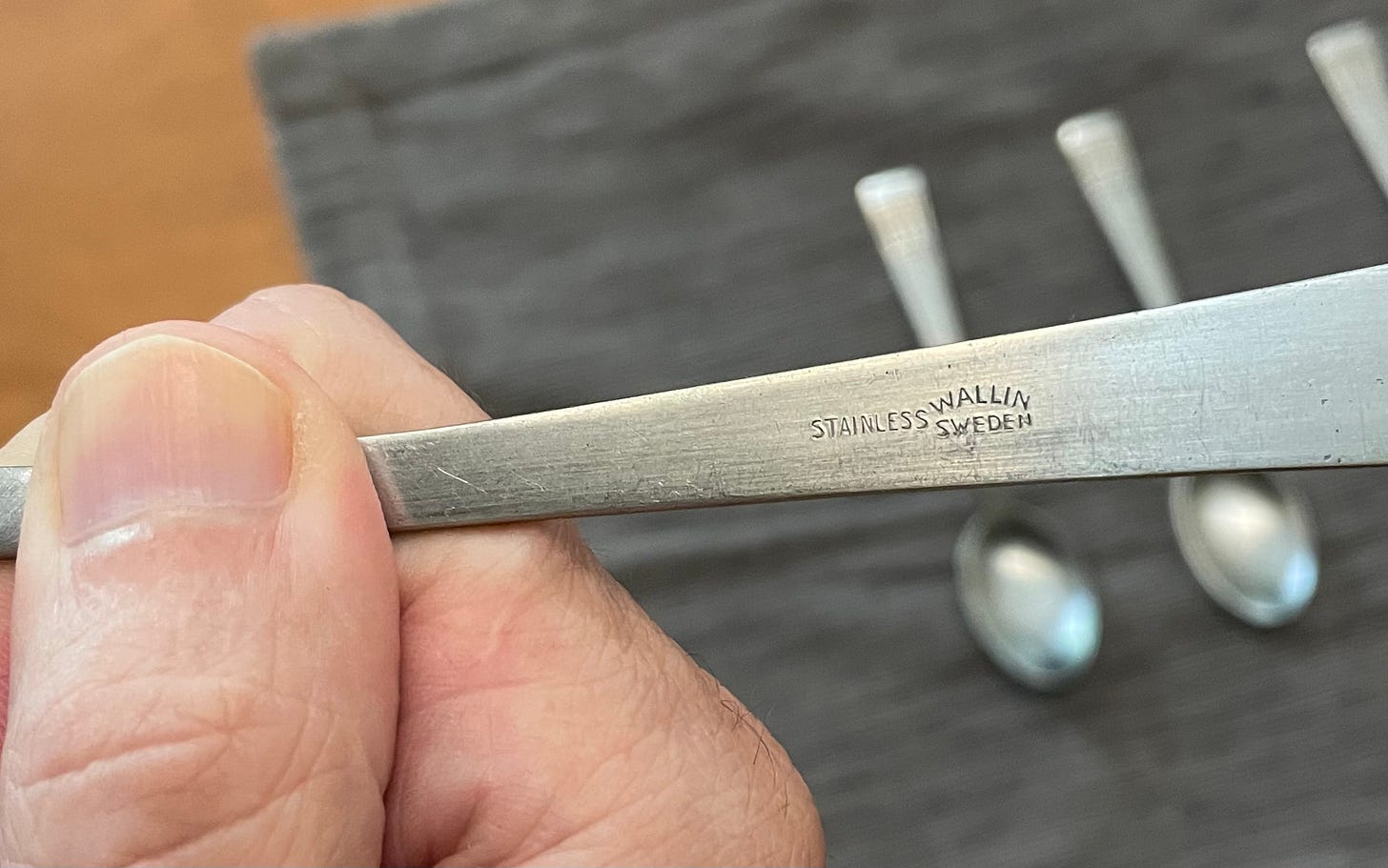 When I was growing up, our family had two sets of silverware. There was a fancy set, made of real silver, which was reserved for holidays and special occasions, and a stainless set for everyday use. The five utensils shown above are from that stainless set. They were made by a Swedish brand called Wallin, whose name is stamped into the underside of each piece: