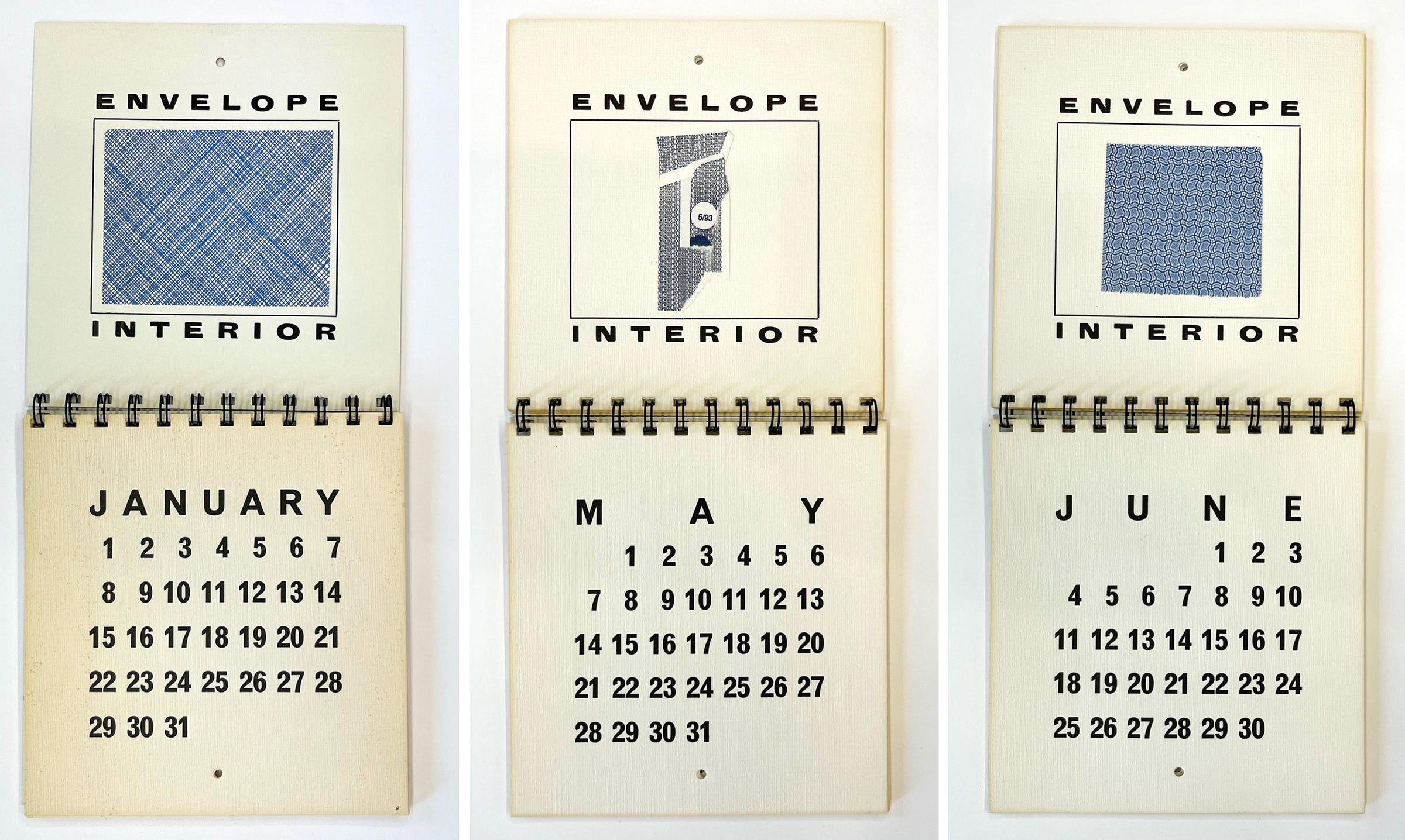 Van Horn has done several projects relating to “envelope interiors” (that seems to be her preferred term, instead of “security patterns”), including a book featuring lots of interior swatches, another book devoted to the narrower niche of airmail interiors, and, best of all, a series of envelope-based pinup calendars! Here are some shots of that: