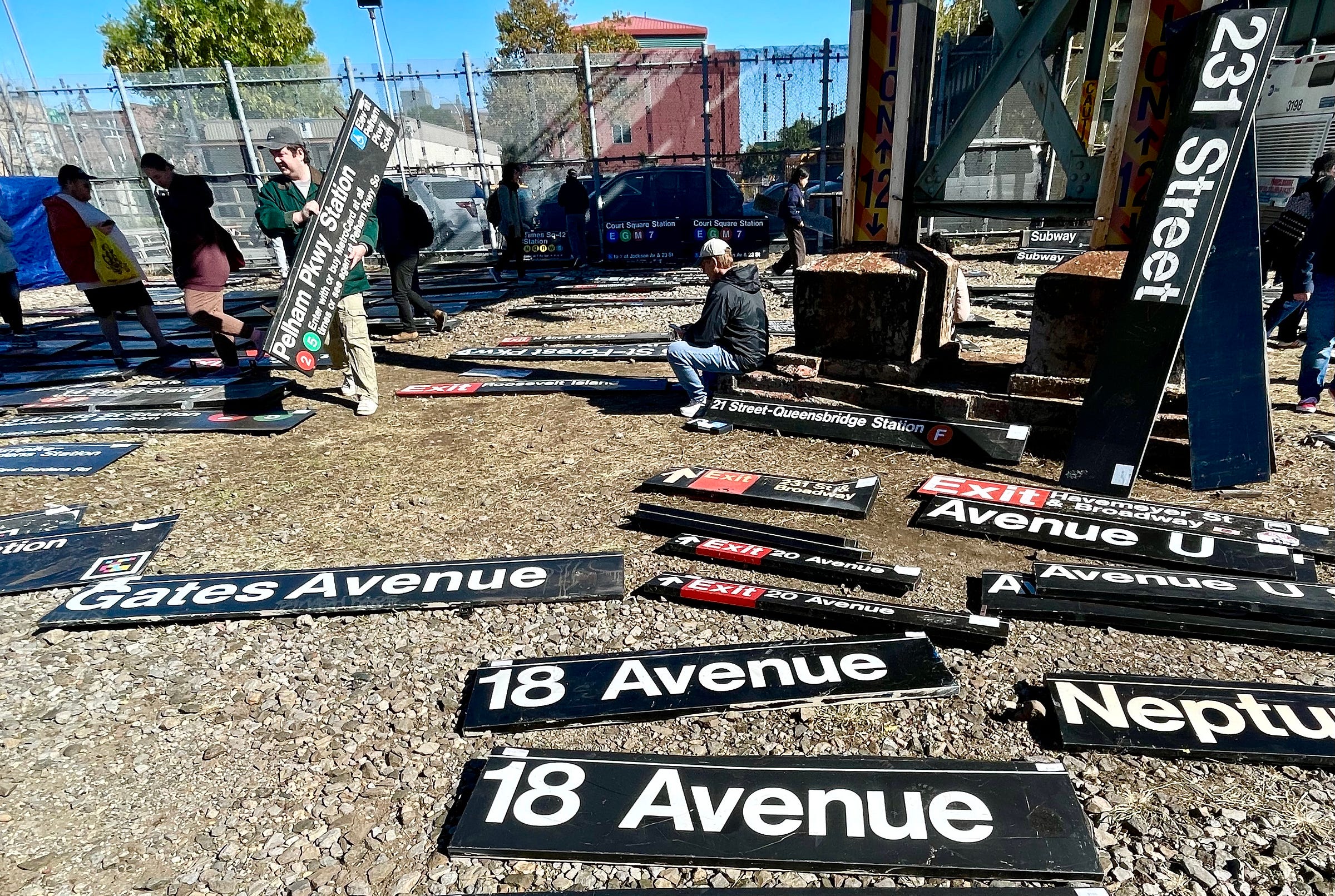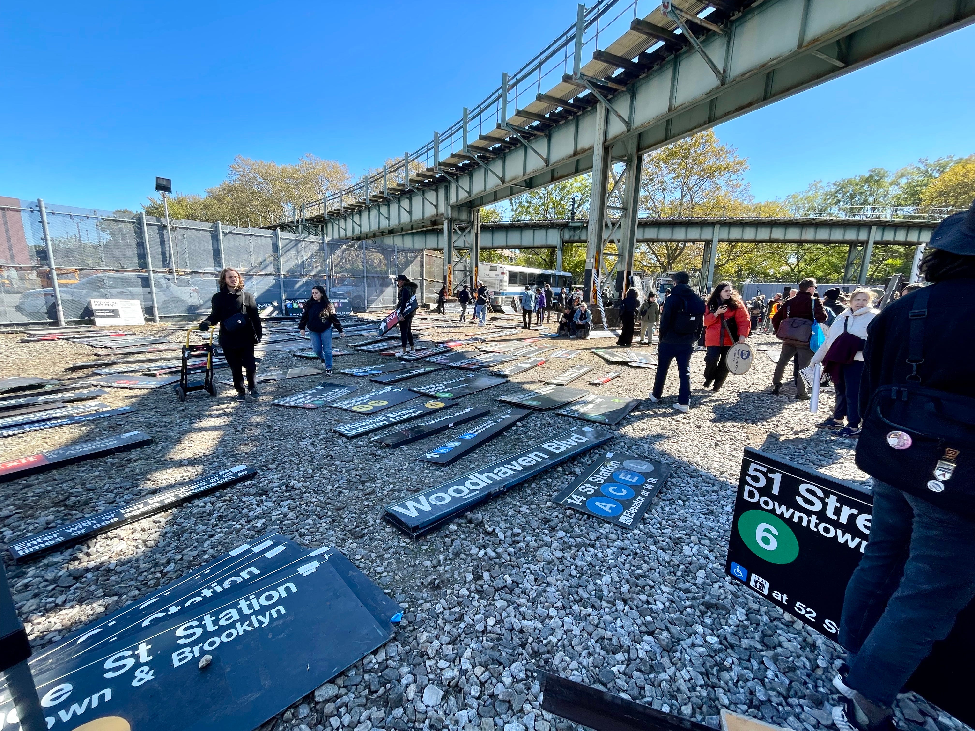 The festivities began last Thursday, October 16th, when the Metropolitan Transportation Authority, the agency that operates New York City’s subways and buses, held its fifth annual sale of decommissioned subway signs. For the previous four years, this event required a reservation, and those slots always filled up in no time flat, so I was never able to attend. But this year the MTA switched to a walk-in format, so I went down to the sale site (a desolate industrial lot in southern Brooklyn) at 10:30am, stood on a line for more than two hours, and then finally got inside.