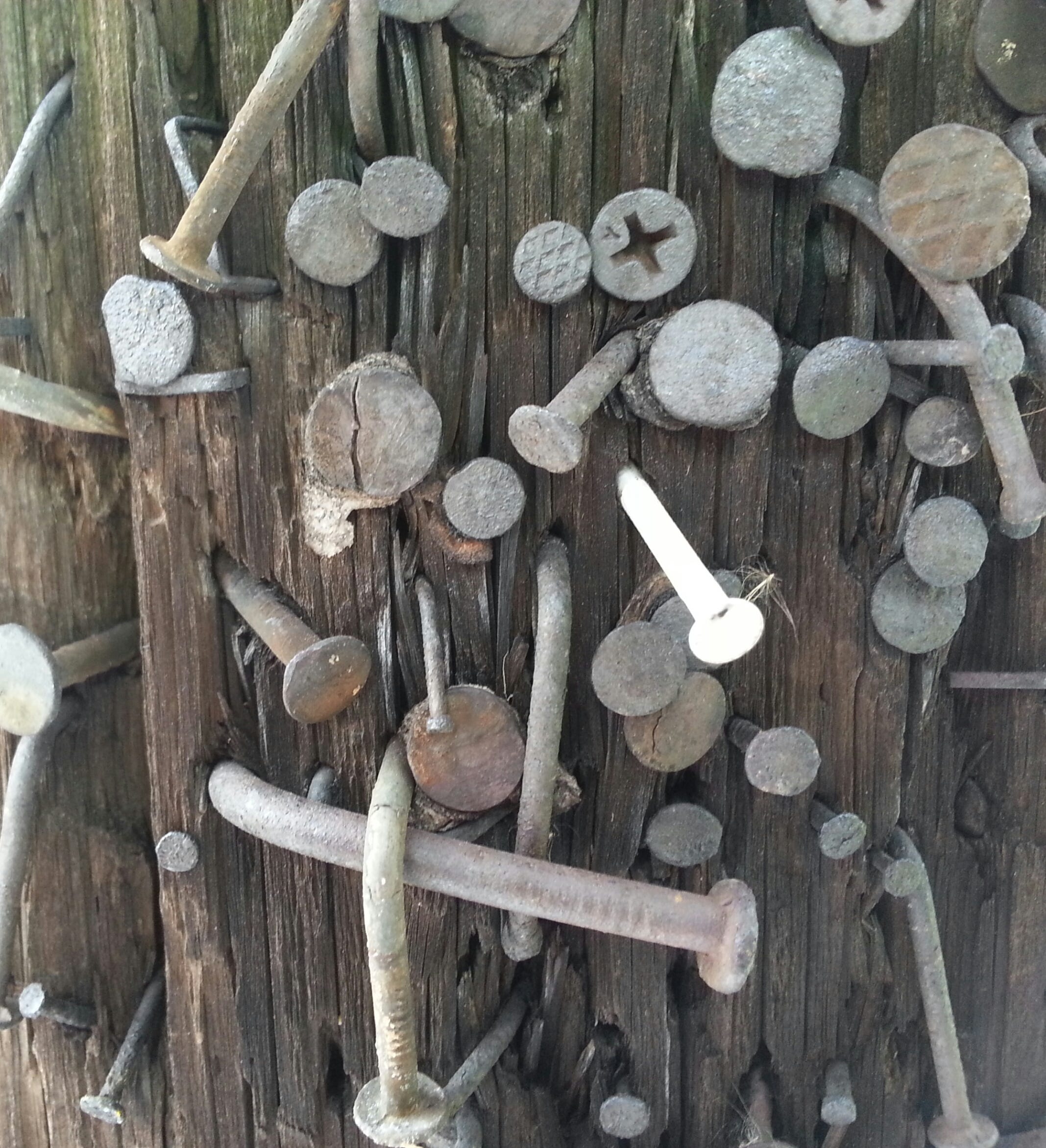 Although you can’t see it in that long view, the pole’s surface is full of nails, screws, and staples, and Kurt’s reaction to it was similar to my childhood response. “I was intrigued by all of the different nails and screws, the different sizes, nail heads, textures, etc.,” he recently told me. “I thought it looked really neat, almost artsy as opposed to being an eyesore.”
