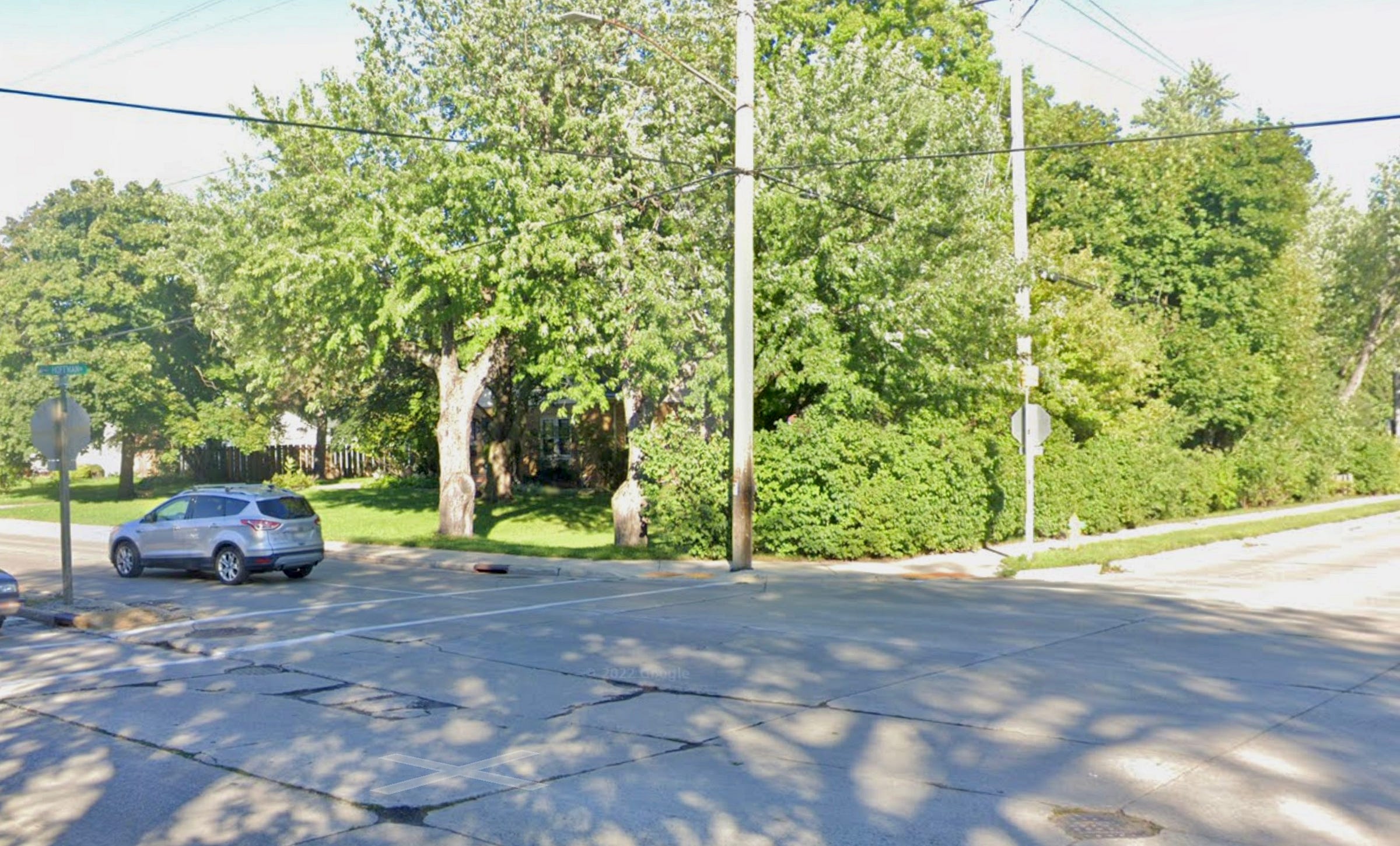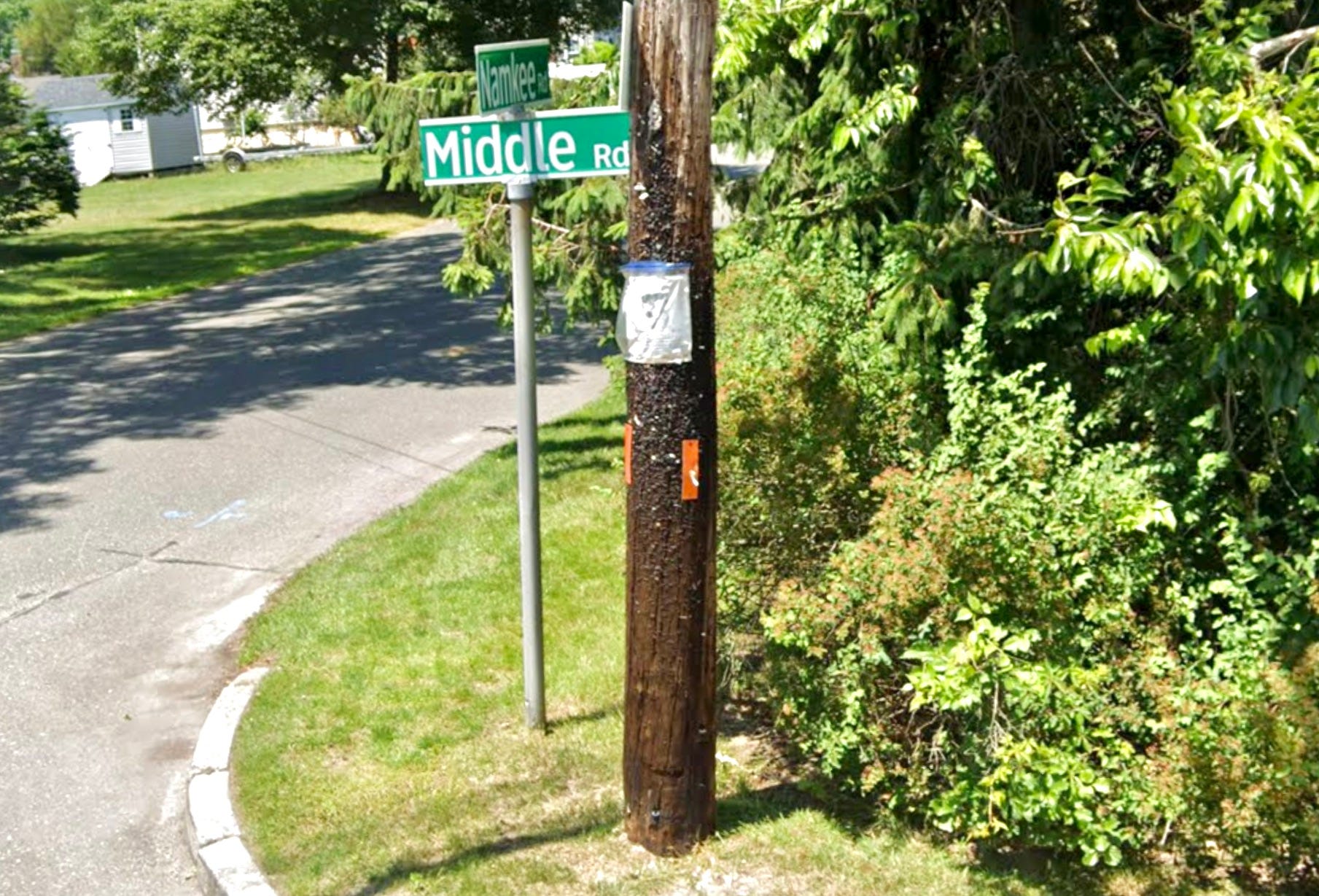 That street corner is shown above. There’s still a pole there (it might even be the same one I grew up with1), and if you zoom in on the photo you’ll see that it’s still covered in nails and staples.