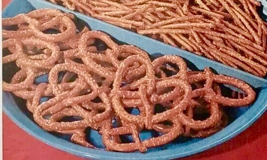 I’m not sure exactly when extrusion began killing off the pretzel twist, but it definitely happened within my lifetime. When I was growing up in the 1970s and ’80s, supermarket pretzels still had the twist (I can say that with some certainty because the twist was my favorite part to eat), but I began noticing some twist-free pretzels in the 1990s. The tipping point presumably came soon after that, and extrusion’s triumph is now almost complete.