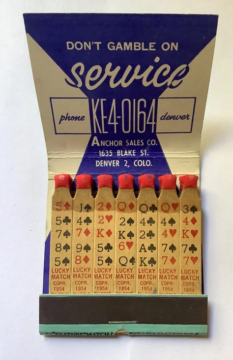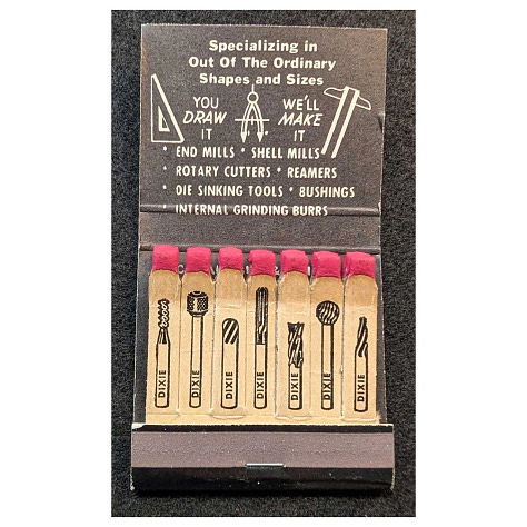 It’s easy enough to see the appeal. A well-designed matchbook cover is like a miniature poster, plus there’s the nostalgic charm and the pyro factor. In addition, some matchbooks, called feature books, offer the bonus fun of having designs printed on the matchsticks (click thumbnails for larger versions):