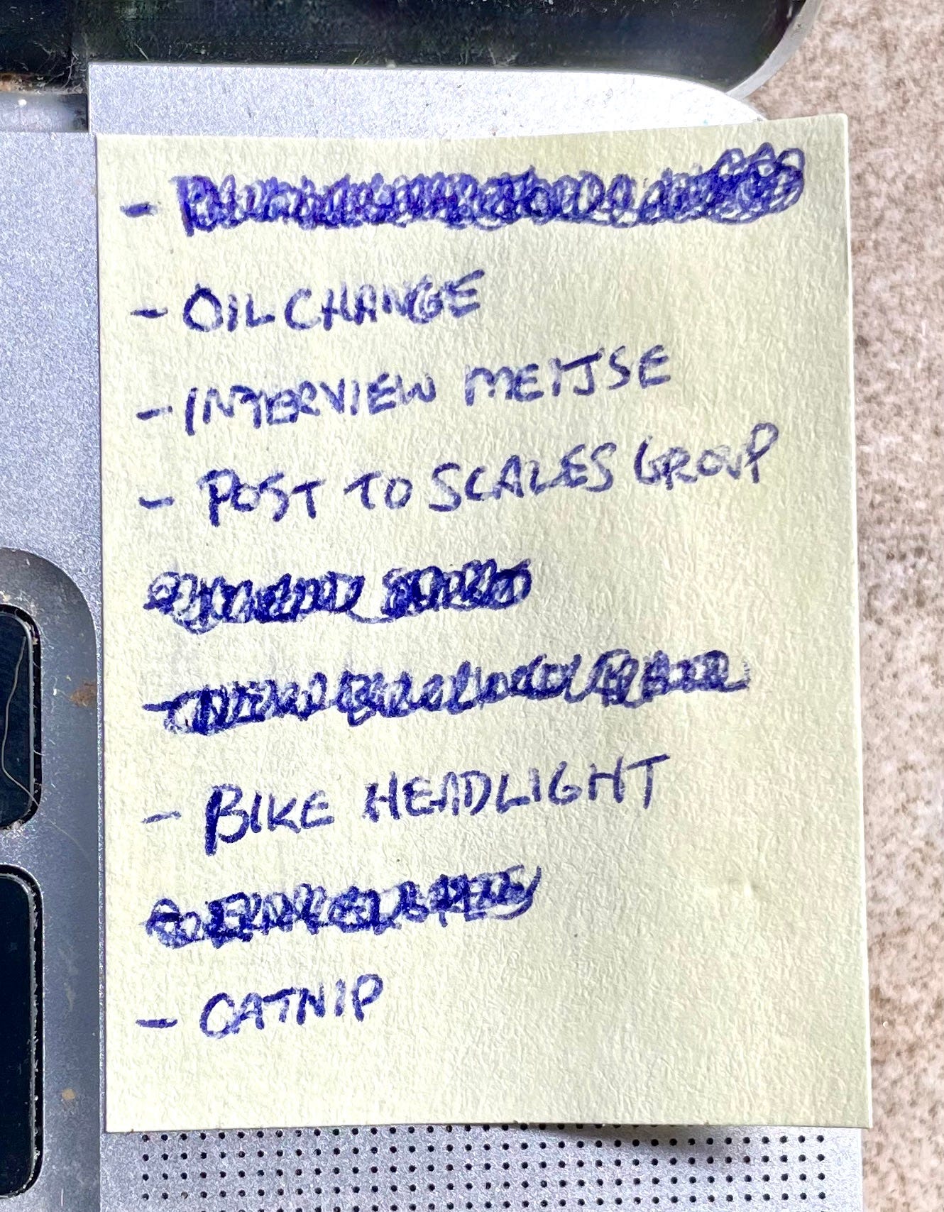 That brings up a key list-keeping variable: how to mark a completed item. I know some people like to draw a single line, like this. Others employ the checklist method, which entails drawing a little box next to each list item and then either filling in the box or marking it with a check mark or an “X.” But I prefer to use swirly lines to completely obliterate the line item: