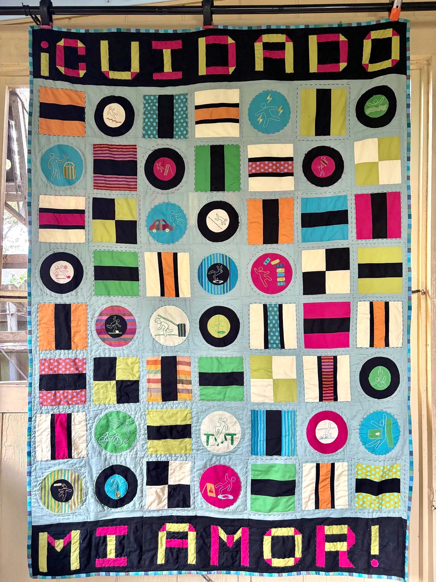 Rob’s wife, E, recently presented him with a spectacular birthday gift: a handmade quilt adorned with various iterations of Cuidado Man and other imperiled stick figures. You can see some of the embroidered squares above, and here are a few more photos: