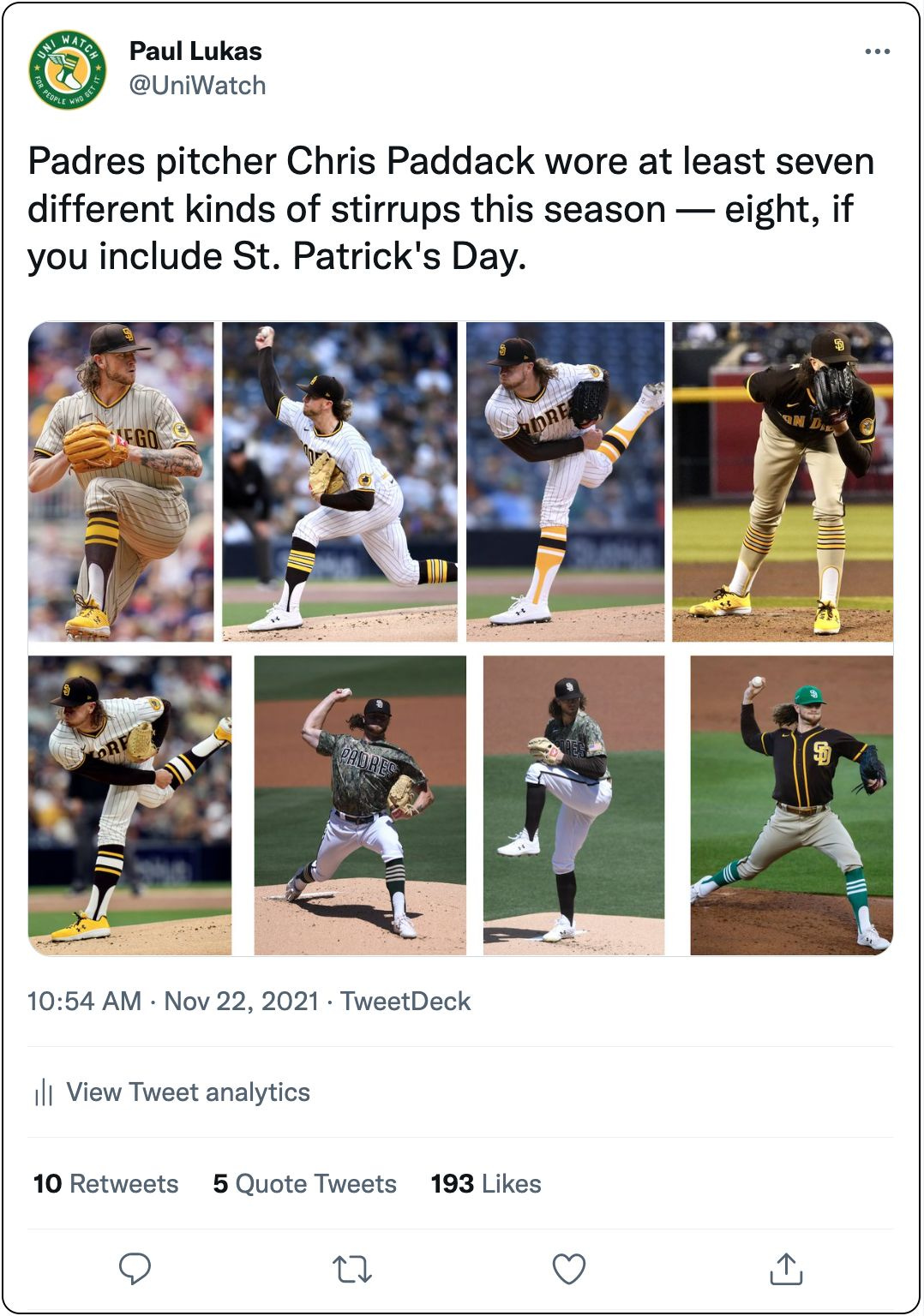 If you’ve read Uni Watch for even a short amount of time, you probably know that I love baseball stirrups. And for the past three seasons, nobody in the big leagues has worn them better than pitcher Chris Paddack, who broke in with the Padres in 2019 and quickly established himself as MLB’s preeminent hosiery hero.