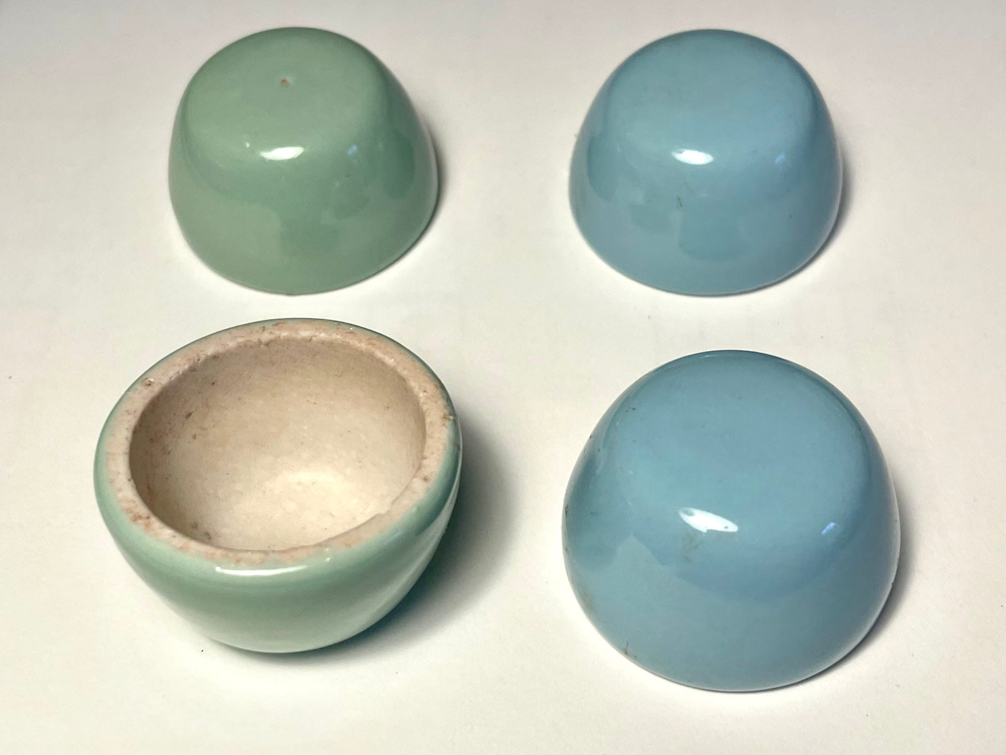 Although Summers’s patent application refers to a “plastic cover,” early bolt caps were often porcelain, just like the underglaze color samples. In fact, you can still find porcelain caps being sold by vintage dealers.