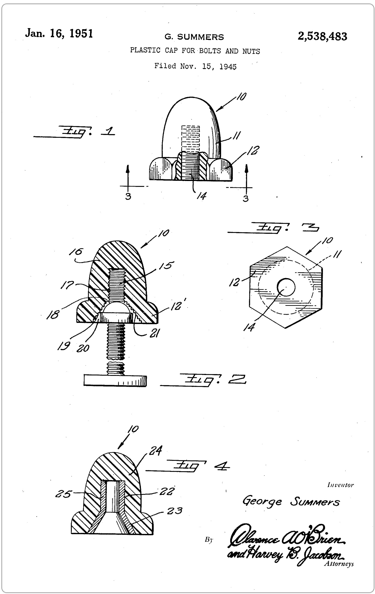 Toilet bolt caps are such a classically inconspicuous topic that I’m surprised I’ve never written about them until now. It’s not clear exactly when they were invented, but the first patent for them appears to have been granted in 1951, to an inventor named George Summers. In his patent application, he stated, “My invention … consists of a cap for bolts, nuts and the like, an object of which is to provide a plastic cover for the unsightly exposed ends of such hardware.” A few paragraphs later, he added, “A further object of this invention is to provide such a cap formed of a color to match bathroom or other fittings.”