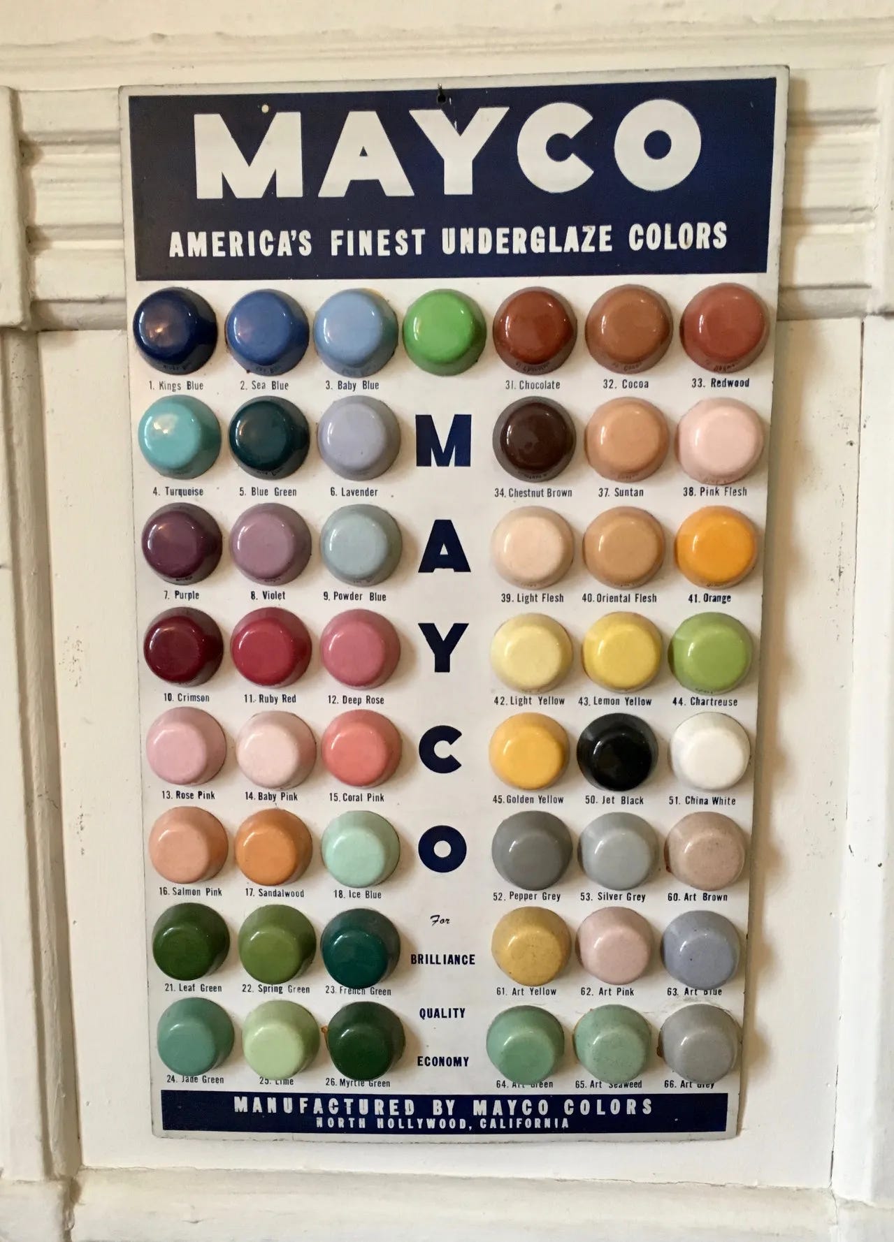 It all started a few weeks ago, when I wrote that article about decorator colors. Toward the end of that piece, almost as an afterthought, I mentioned that I used to have a vintage display of ceramic underglaze colors. I sold it back in 2018, but I still had this photo of it: