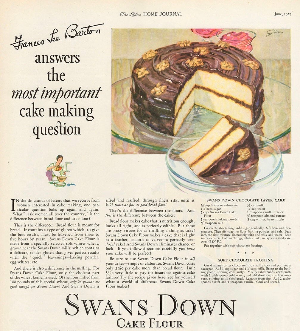 Until recently, I thought the answer for conventional round cakes was obvious as well: You cut them into triangular wedges, as seen in the 1927 magazine ad shown above. It worked fine back then, and it still works today.