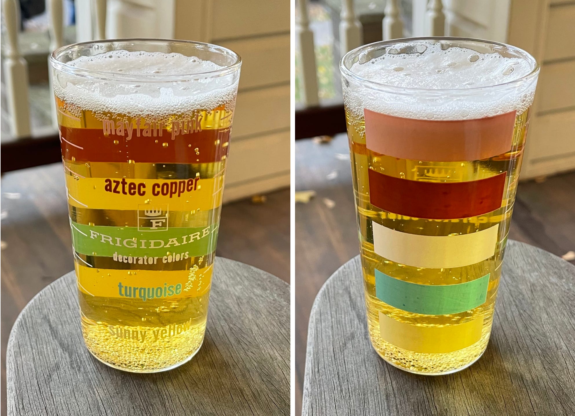 That’s part of why I like the Frigidaire glass so much. In addition to being a de facto color catalog, it’s a functional object, so I can have the fun of engaging with it on a regular basis. In fact, it’s already become my beer glass of choice for meet-ups on my neighbor Jason’s porch (as seen in this article’s header photo).
